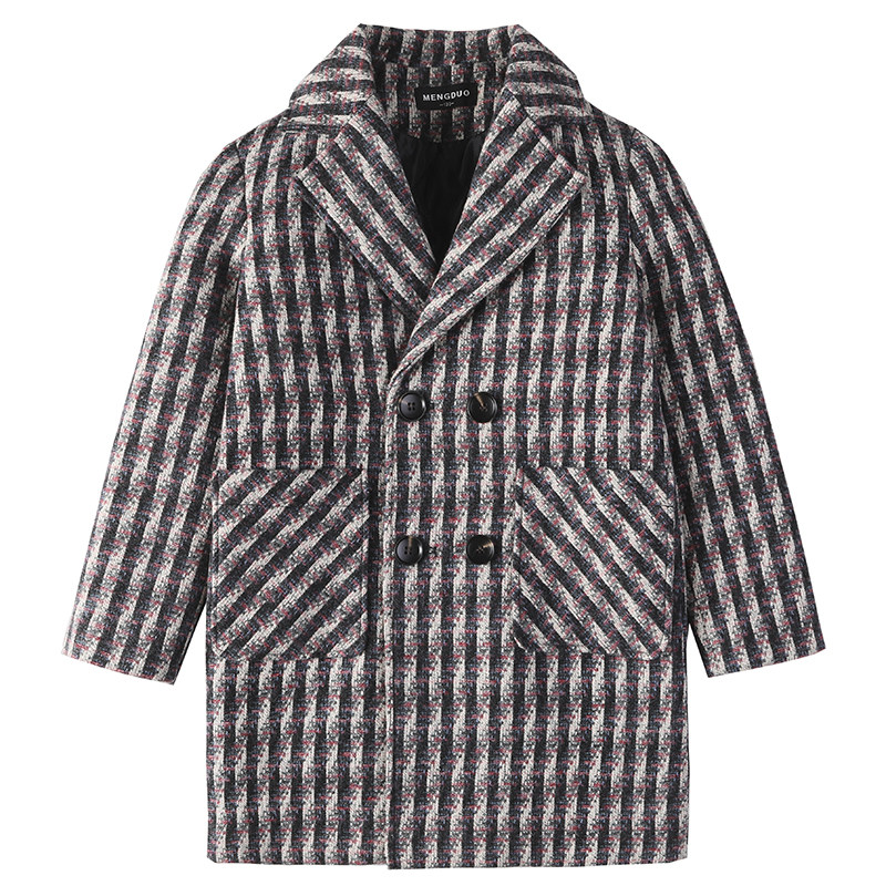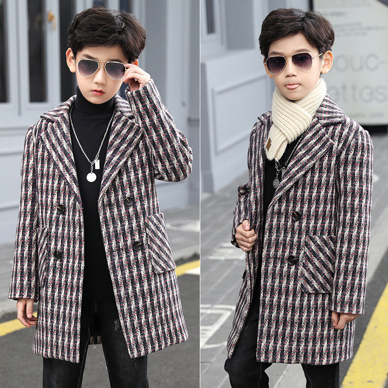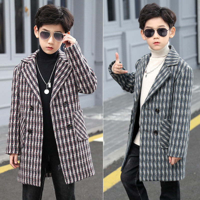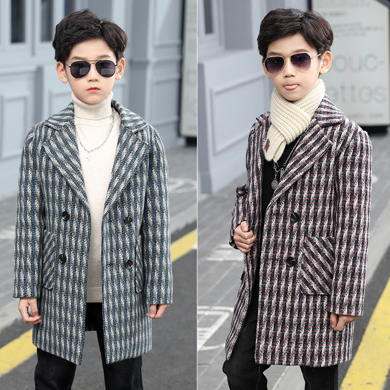 Boys' woolen coat striped mid-length version 2022 new autumn and winter woolen coat medium and large children's clothing Korean version trend