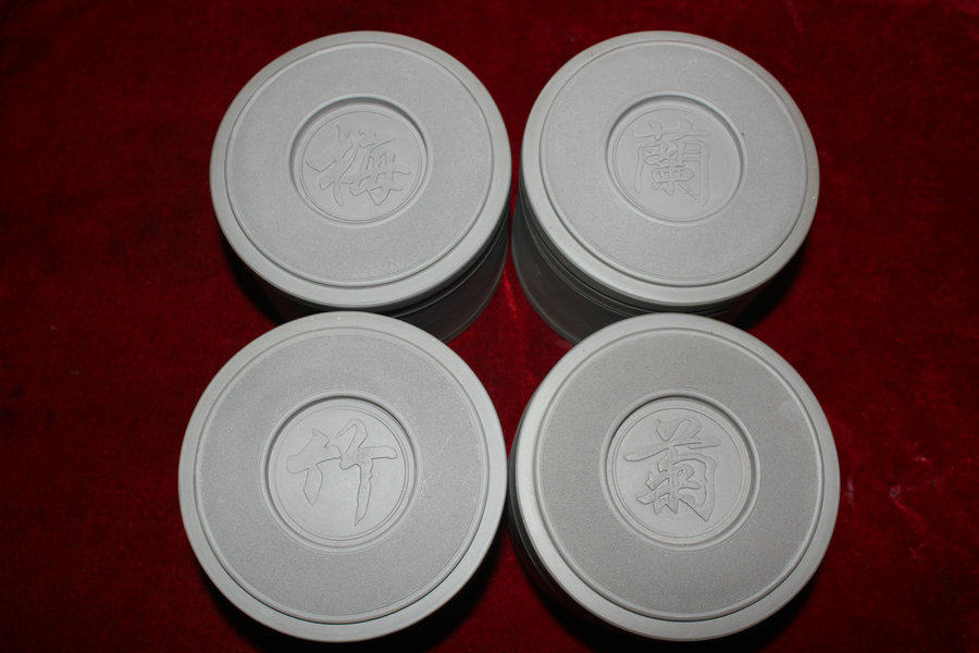 Cricket pot, cricket pot, Gu Guomin, a set of pots with plum, orchid, bamboo and chrysanthemum, green and white mud pot, Suzhou pot, Cheng mud pot