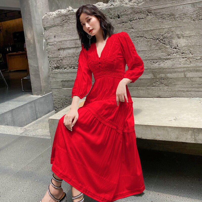 New face-style small crowdcasserin white dress Dress Fairy Supersenson Ensemble of autumn with red V collar Long dress Heavy Industries-Taobao