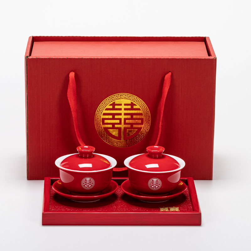 Toast with a toast to a teacup of a pair of teacups a pair of small square trays dedicated to the tea cup with a pair of gift boxes to the tea cup with a pair of small square trays, a pair of biking bowls and chopsticks a pair of double happy bowls, a pair of small square pans and a pair of happy bowls.