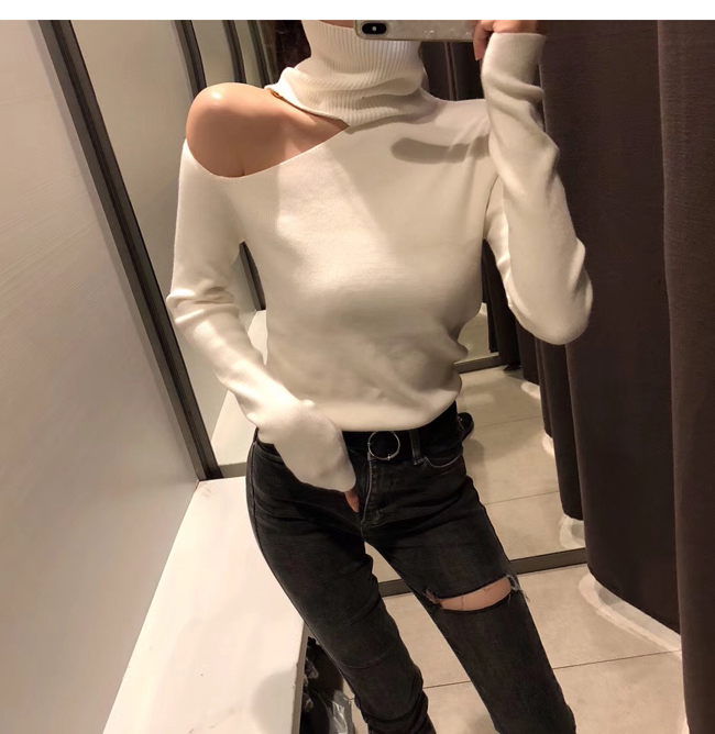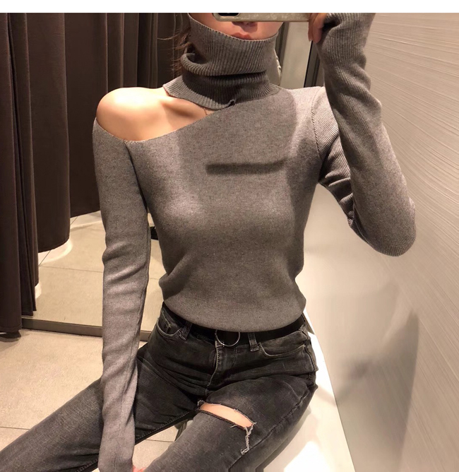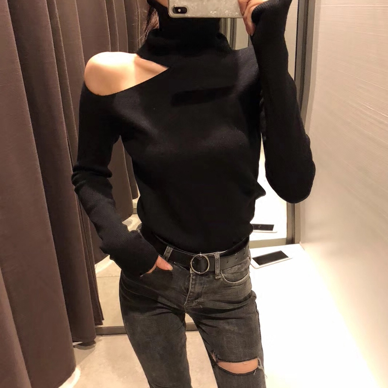 2022 autumn and winter 100 lap high collar Sexy blouse with open shoulder to build up to bottom stitch cardiovert woman long sleeve sweater