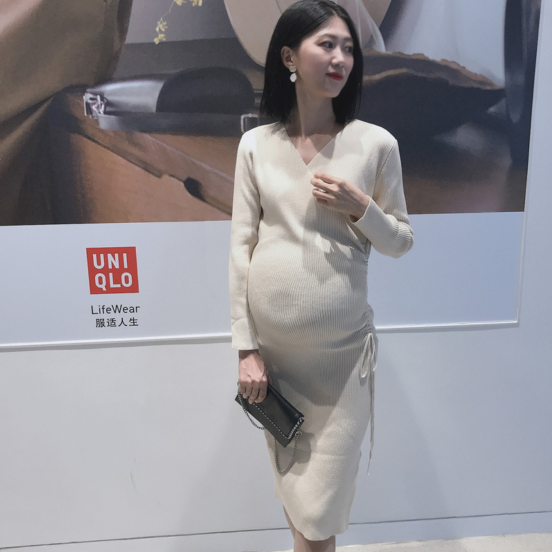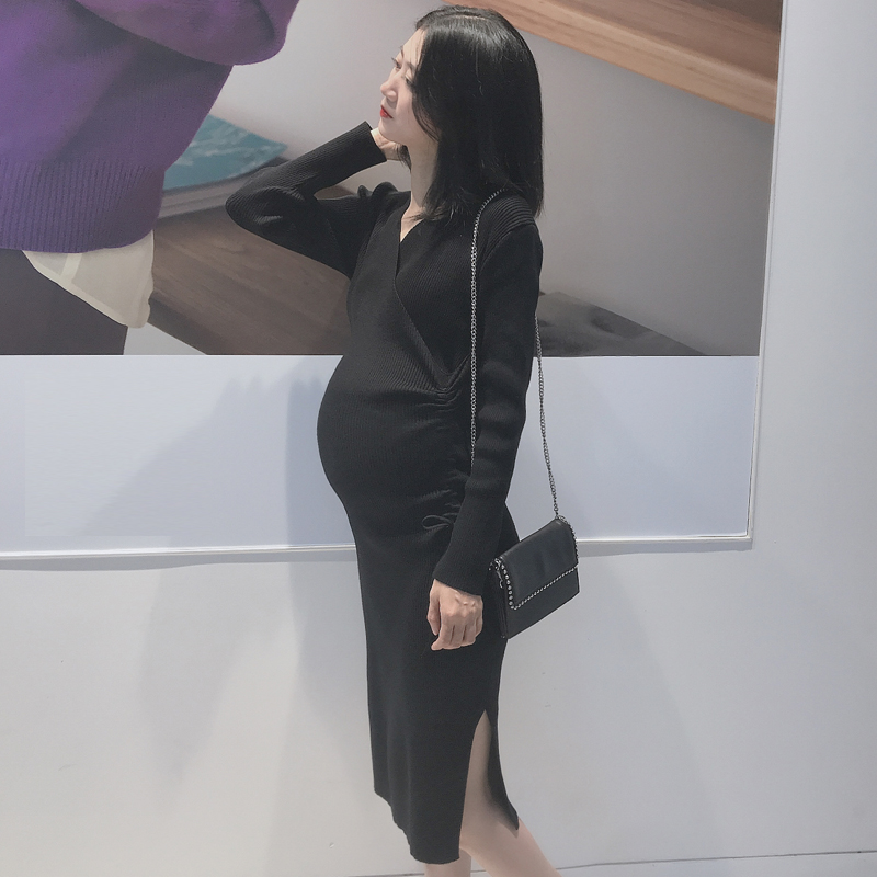 Slim stretch pregnant women's knitted dress long bag breech sweater dress spring and autumn base skirt tight skirt