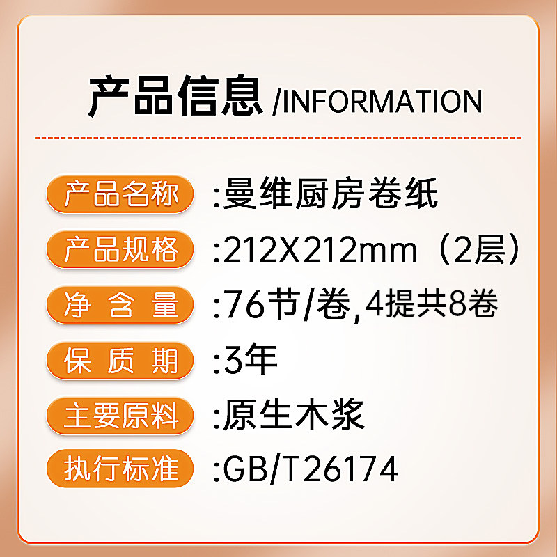 Manvey kitchen tissue roll 8 rolls of fried paper for paper and paper to absorb the paper