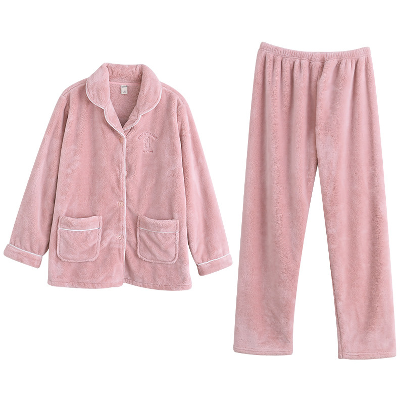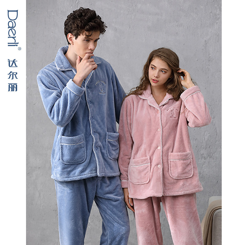 Dalli couple pajamas autumn and winter flannel thickened warm pocket lapel cardigan long-sleeved home clothes two-piece set