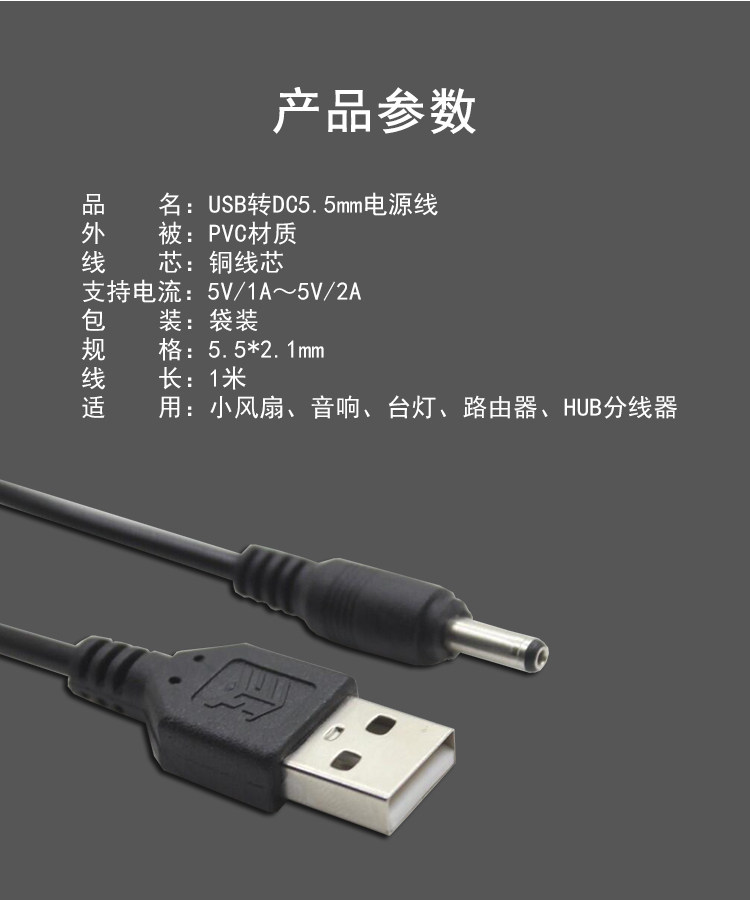 5 5mm round hole charging cable small bee power supply small speaker table lamp small fan round head usb to dc5v charger