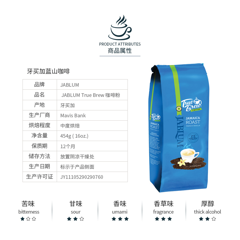 Jamaican original imported JABLUM Blue Mountain Coffee powder Medium baking 160z 454g vanilla taste black coffee