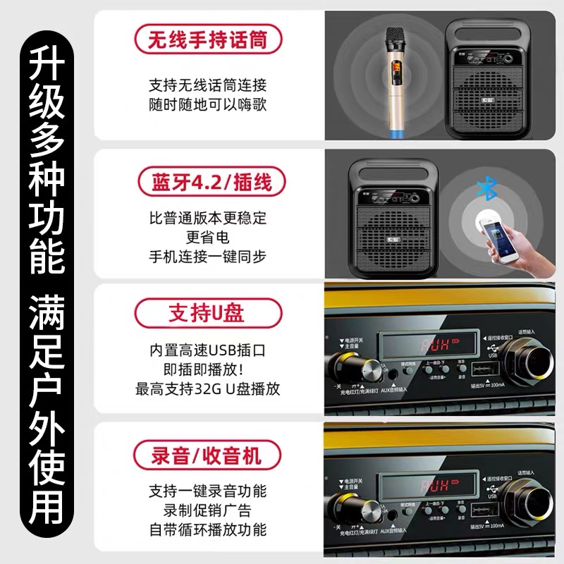 Standard version (remote control, charging cable, distortion-free Bluetooth 6 5-inch woofer) Standard version 32G square dance music U disk Upgraded version (1 wireless microphone) Upgraded version (1
