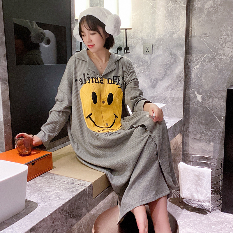 Smiley cardigan long-sleeved pajamas women's spring and autumn cotton long version over knee-length long pajamas new loose-fitting large size home clothes