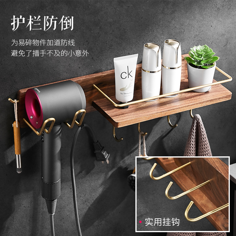 Free Punching Walnut Wood Hair Dryer Shelve Wall-mounted Bathroom Makeup Room Dyson Containing Layer Rack Toothbrush Holder