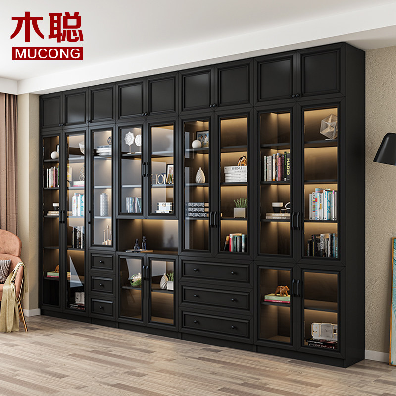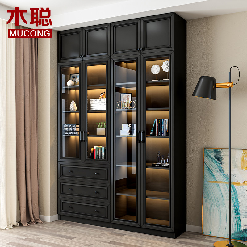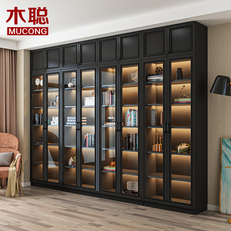Modern light and luxurious black combined bookcase with top cabinet to top glass door landing against wall anti-dust book house solid wood custom