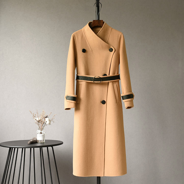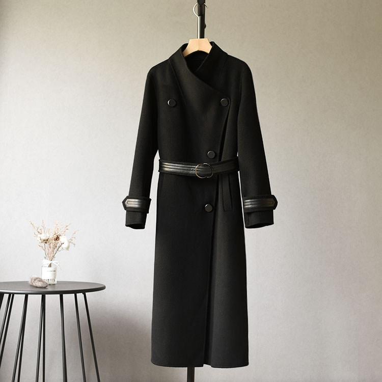 Thin and cross-leather woolen tweed belt jacket double-sided cashmere medium and long version of high-end temperament coat female red