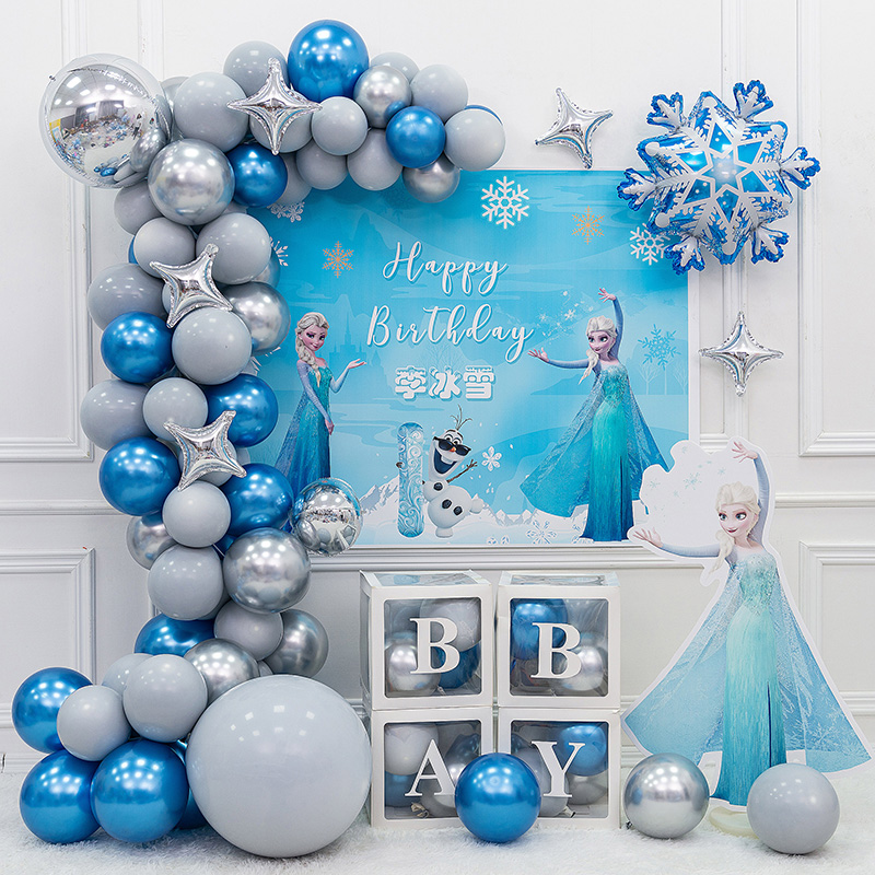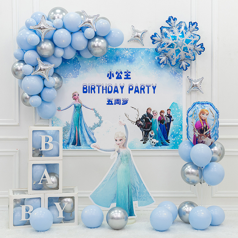 Girl child's birthday decorated balloon scene to arrange ice and snow chic party themed Anna Aisha