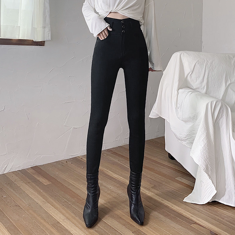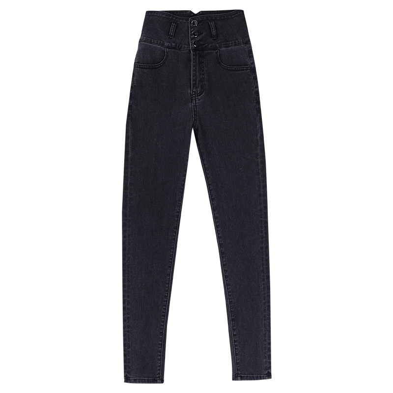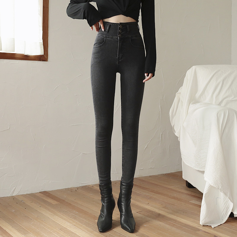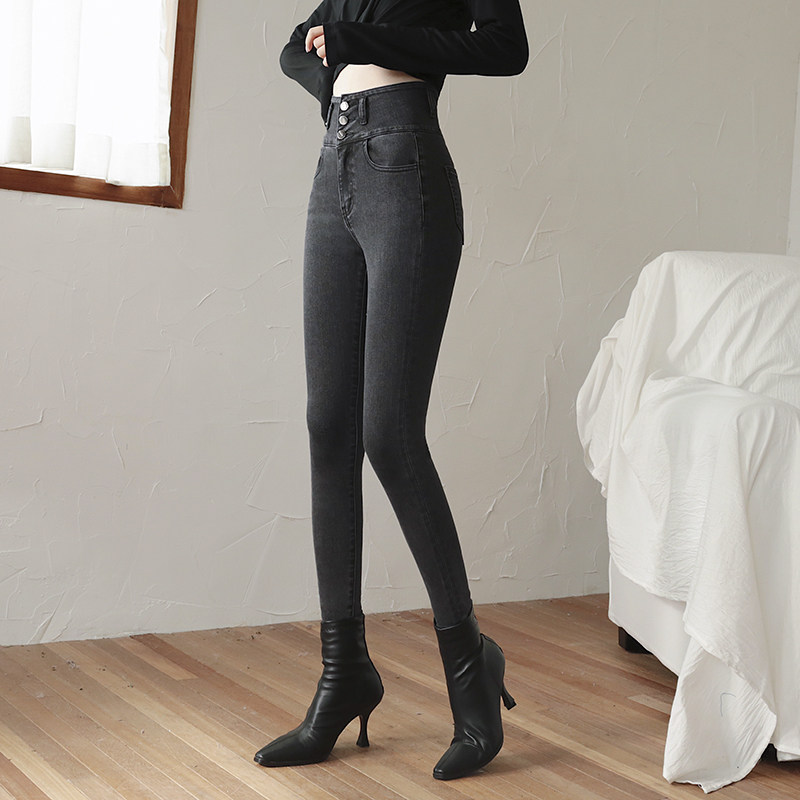 Smoke gray high waist jeans women's slim fit and thin feet tight trousers autumn and winter 2022 new style plus velvet thickening