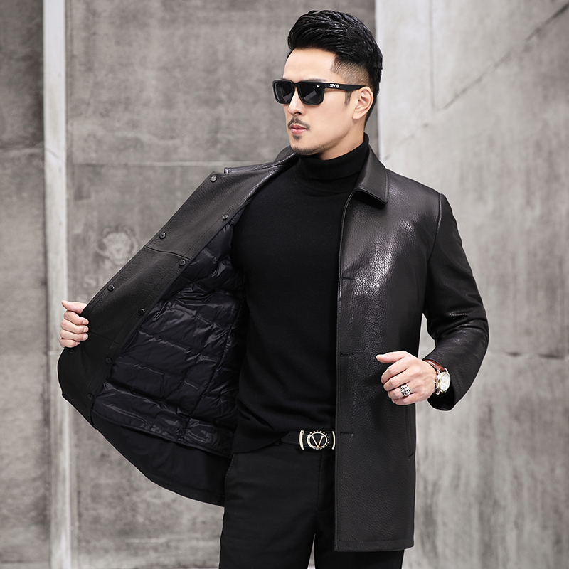 Genuine leather jacket men's lapel mid-length goat deerskin pattern Haining genuine leather down jacket men's leather jacket jacket winter