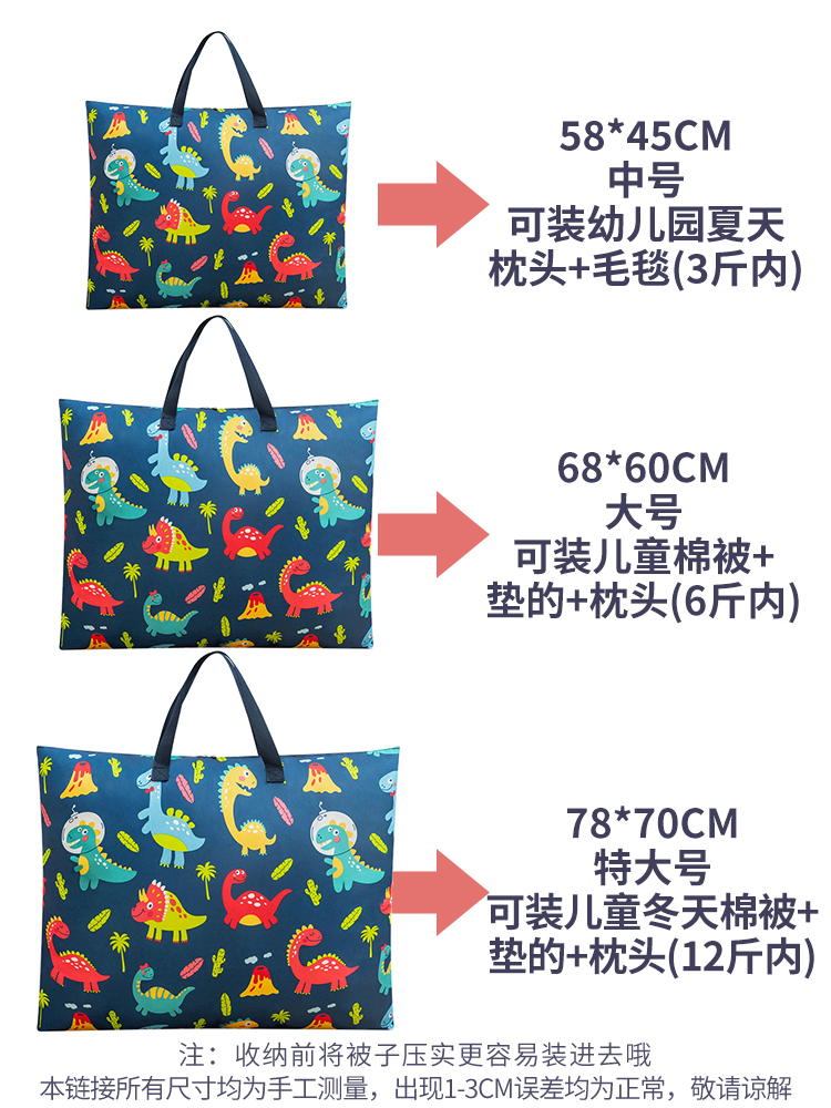 Medium size=58*45cm (it is recommended to store the summer quilt within 3 catties, a three-piece set for kindergarten in summer) Large size=68*60cm (it is recommended to store the winter quilt within 6 catties, a three-piece set for kindergarten in winter