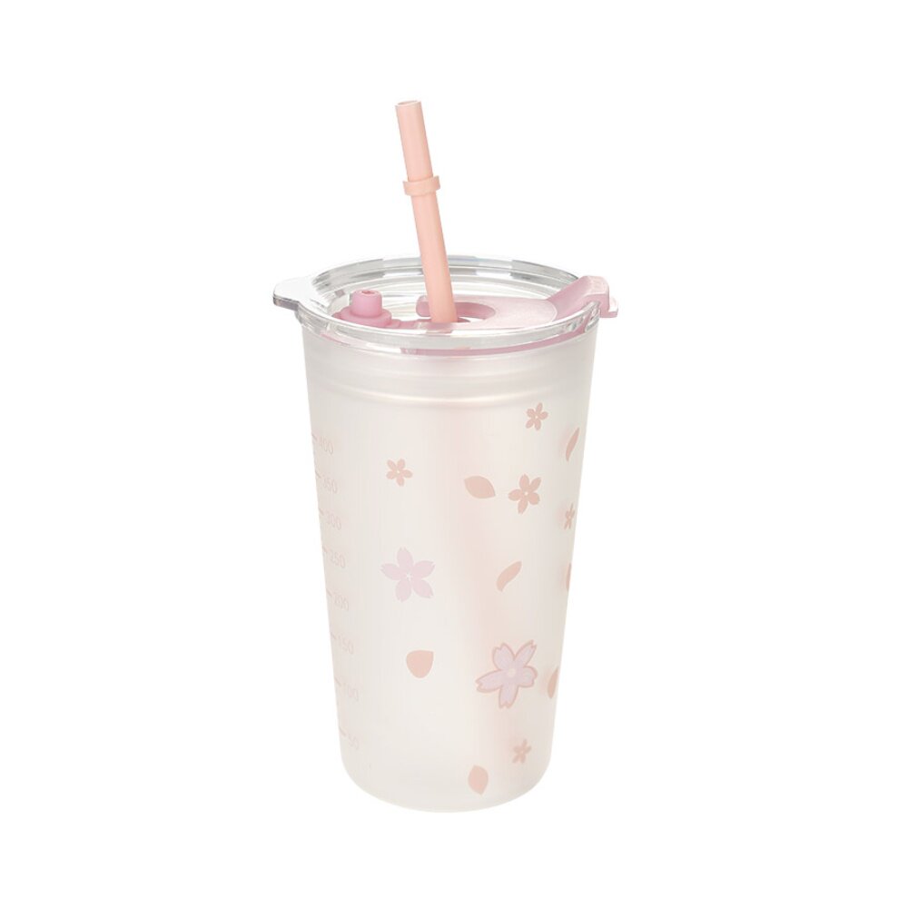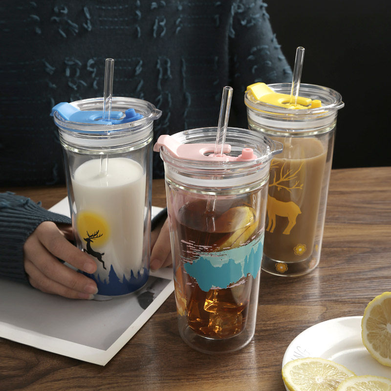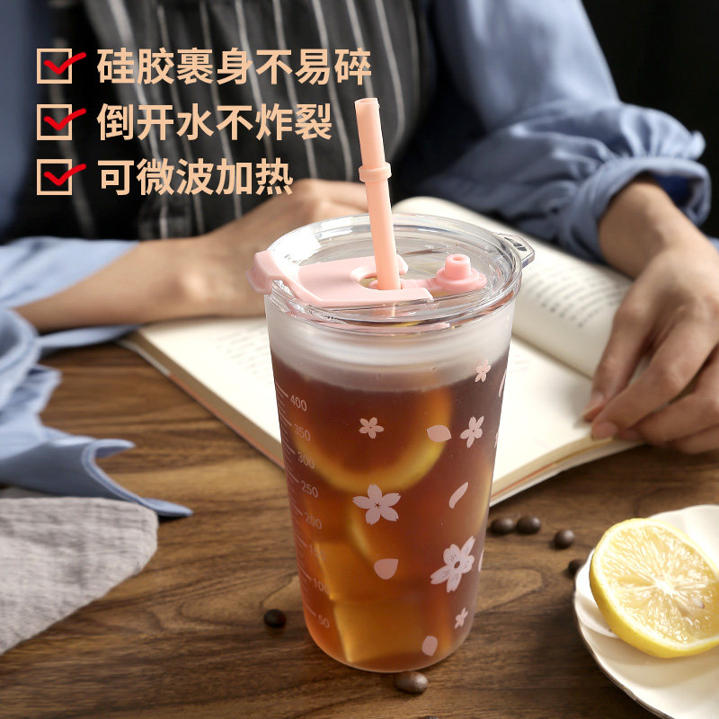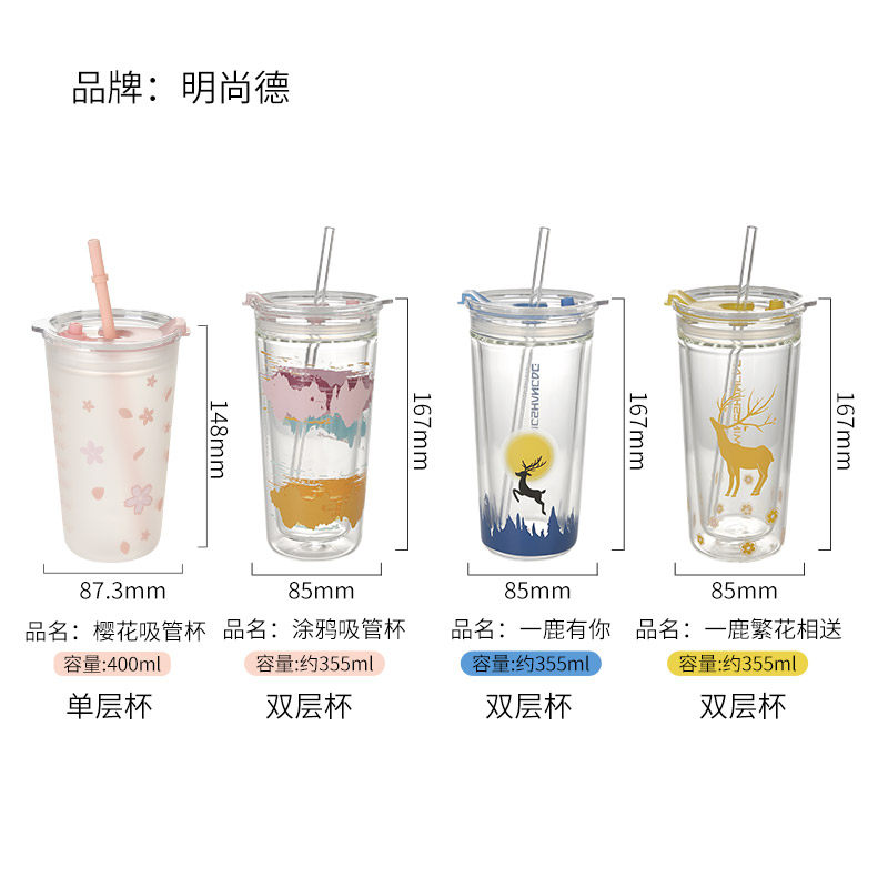 Minsand cute glass straw cup scale cold drink cup 400ml water cup women summer large capacity cup with lid