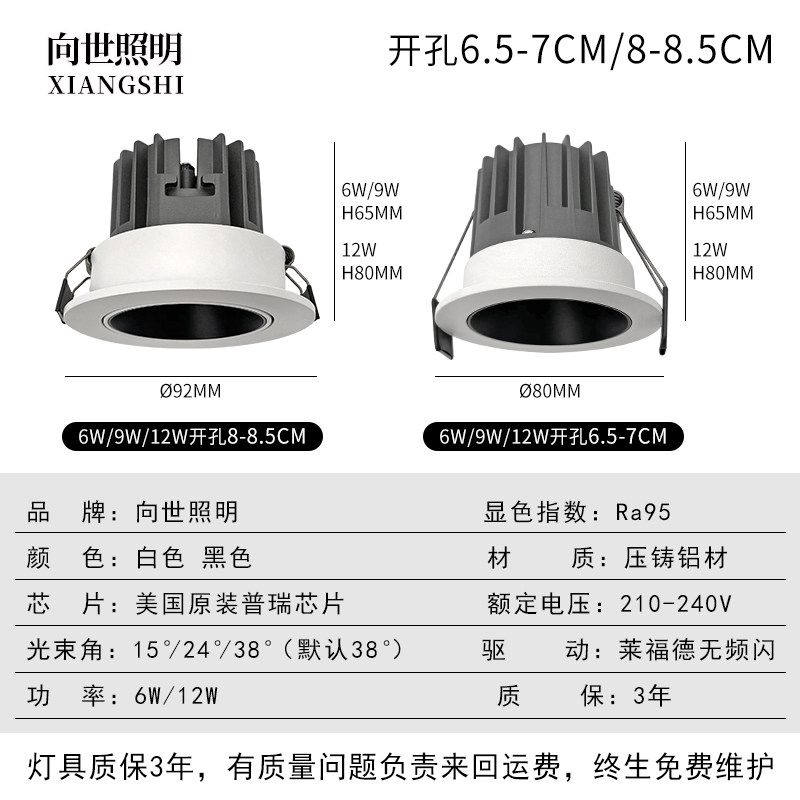 Xiangshi Lighting anti-glare LED spotlight embedded COB black deep cup sees the light but does not see the light 6-7CM8-8 5 drilling