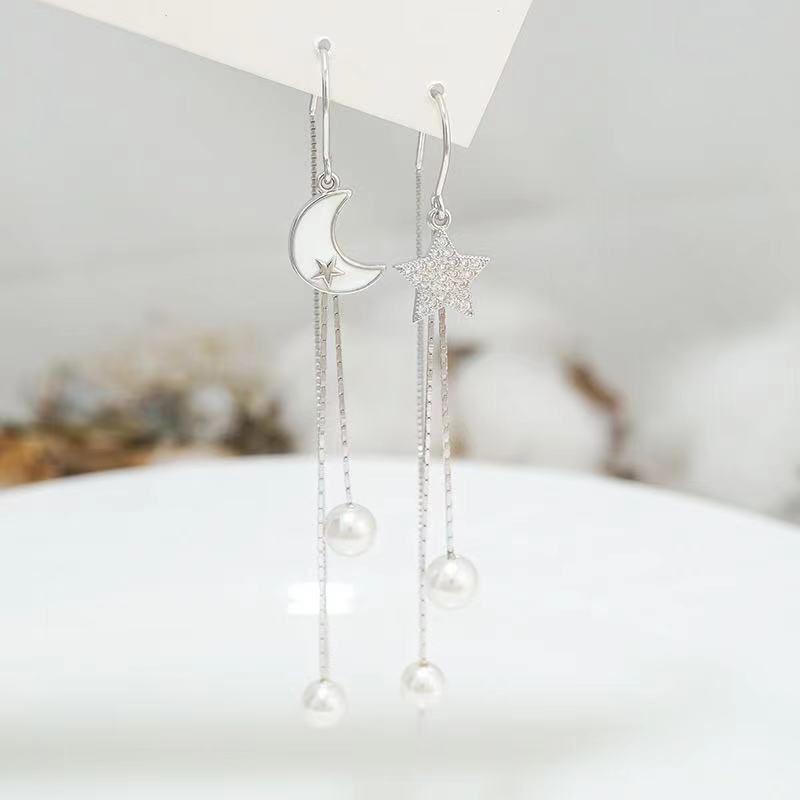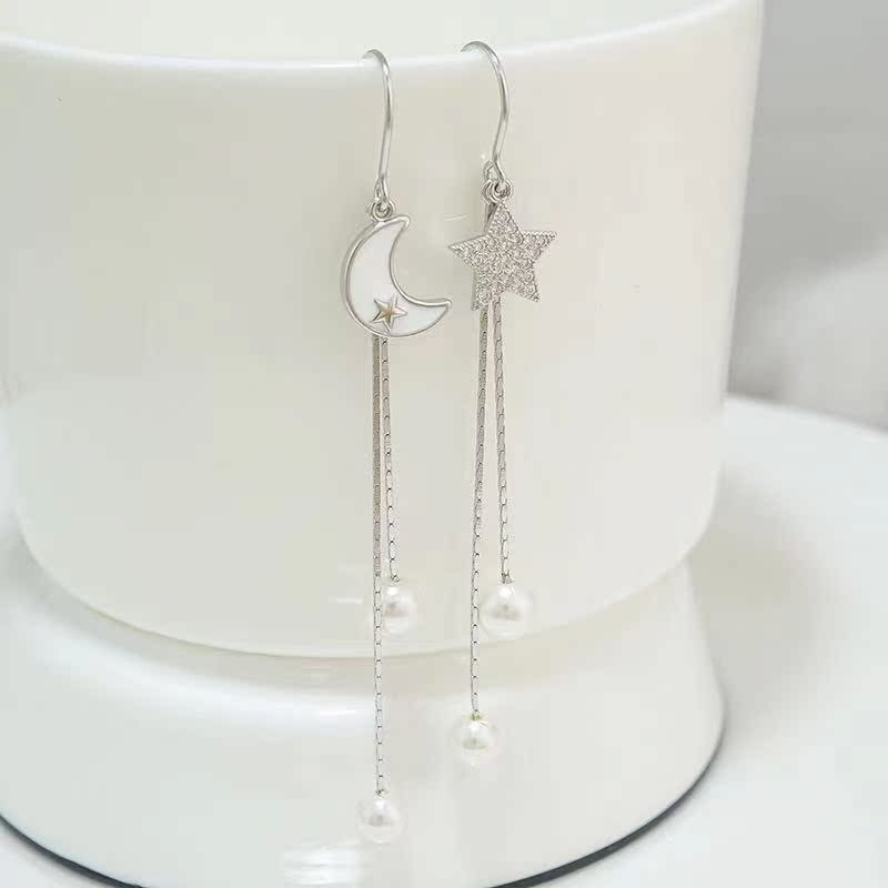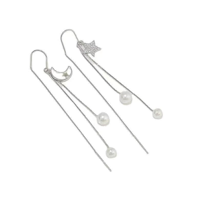 South Korea s925 Earrings Asymmetrical Stars Moon Pearl Pentagram FLOW SUEAR Long version of pure silver earrings