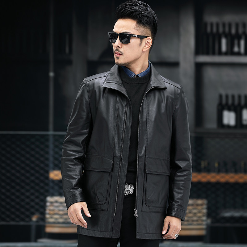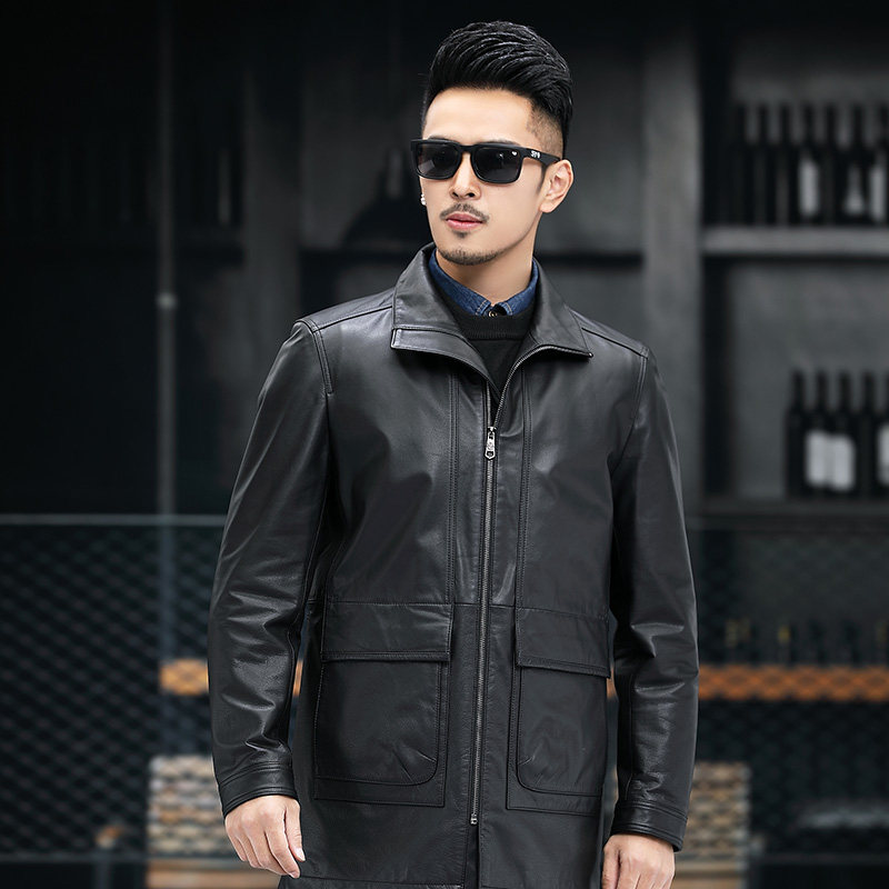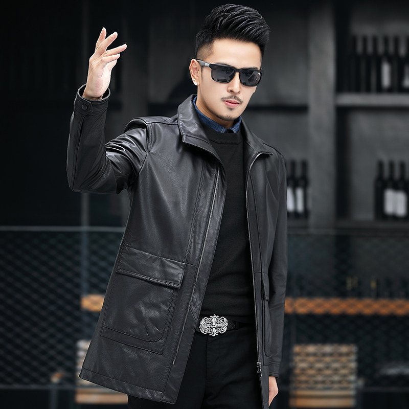 Haining leather leather leather men's long slim business leisure first layer cowhide lapel leather windbreaker new coat