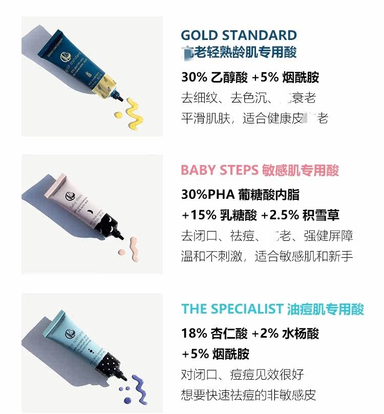 K old special acid (gold standard) sensitive muscle special acid (babysteps) oil pimple special acid (the specialist)