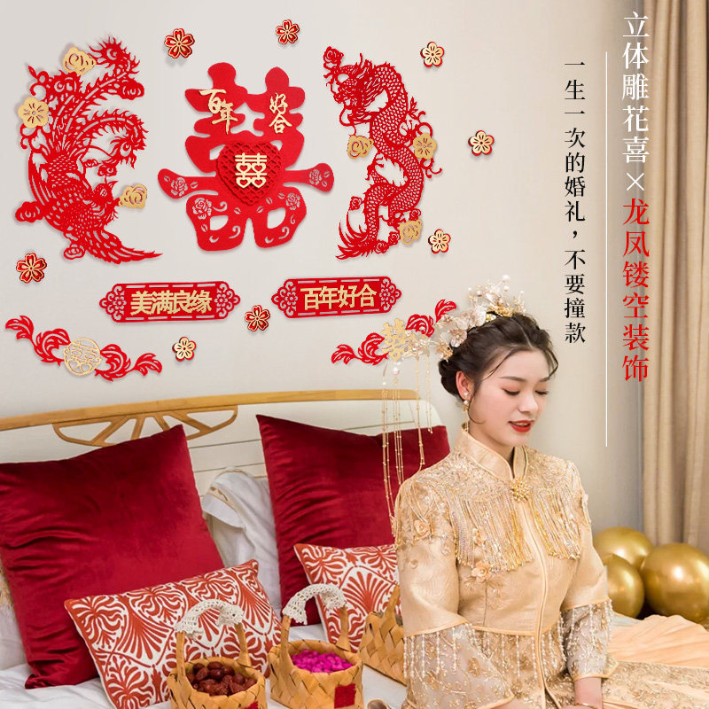 Wedding room decoration set creative Chinese wedding woman I am a hi word pull flower decoration wedding dragon phoenix bedside wall sticker