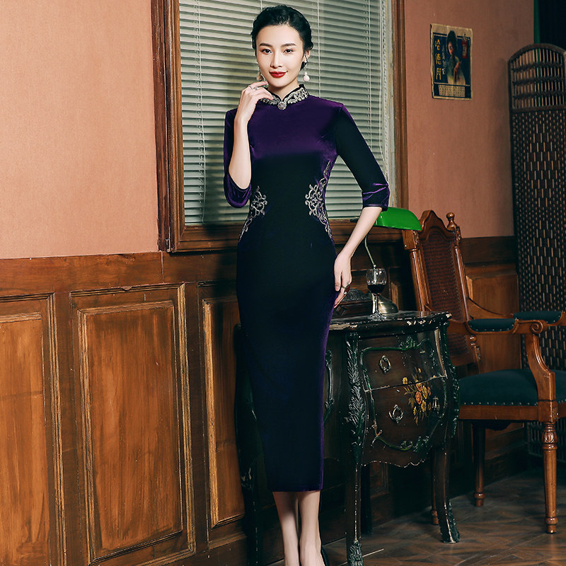 Long embroidered cheongsam 2022 autumn new wedding mother dress noble improved dress can be worn everyday