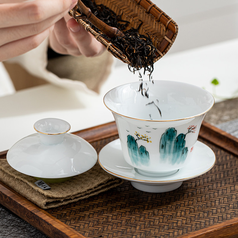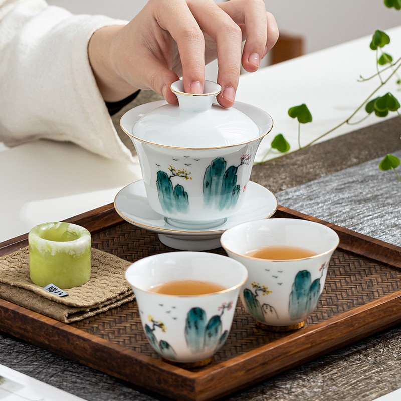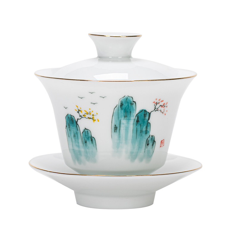 Goat Fat Jade Hand-painted Large Ceramic Handmade White Porcelain Cover Bowl Single Korn Tea Cup Hand Grip Tea 3 Only Bowl Anti-Burn