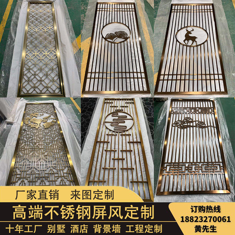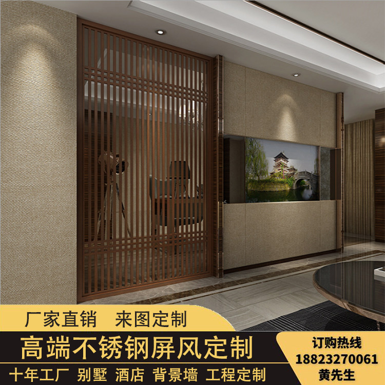 Custom stainless steel screen New Chinese brushed rose gold hollow carved partition black titanium alloy color grille background wall