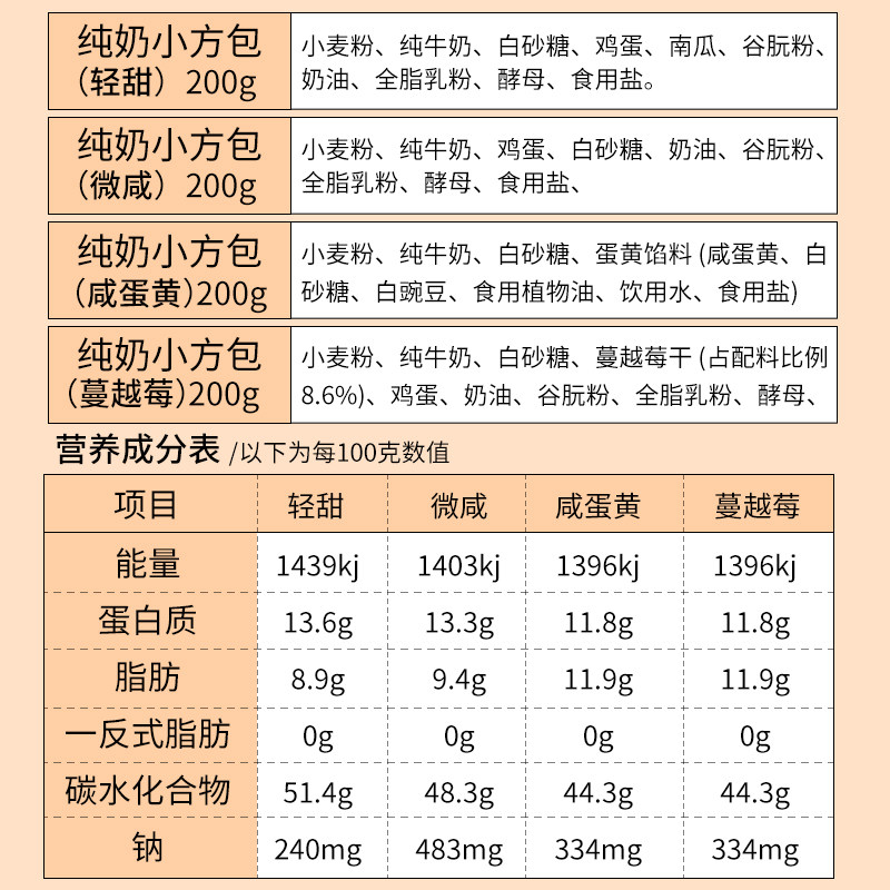 Wheat flour Pure milk White sugar Eggs Pumpkin Cream Gluten Whole milk powder Yeast Edible salt, etc (see product label for details)