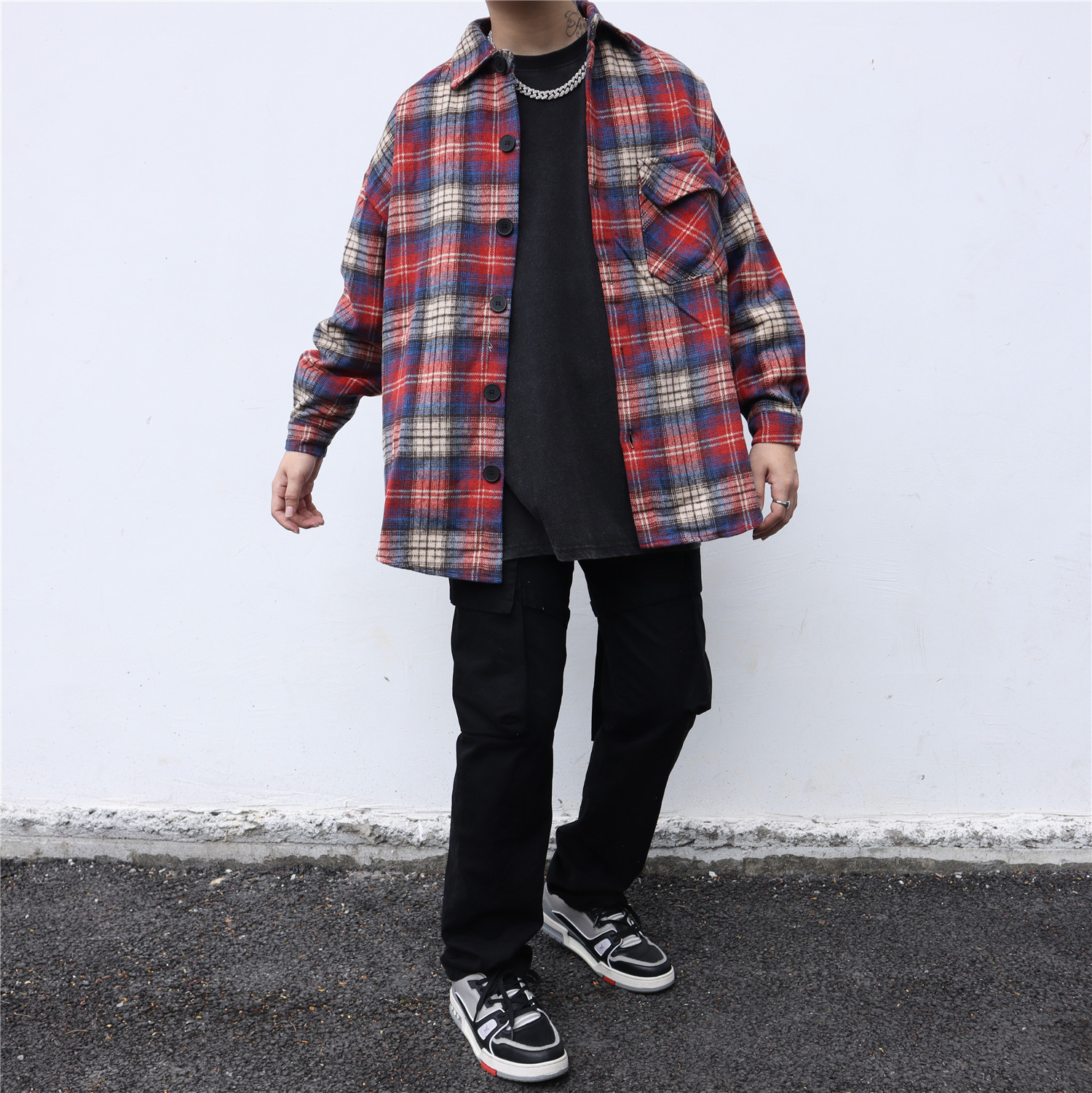 MT99 autumn and winter National tide retro plush plaid shirt men's Tide Street loose casual couple color shirt