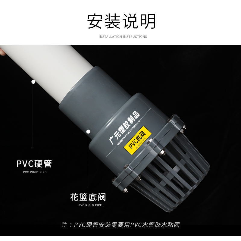 2 inch PVC hard pipe bottom valve (piston type) 2.5 inch PVC hard pipe bottom valve 3 inch PVC hard pipe bottom valve 4 inch PVC hard pipe bottom valve 6 inch PVC hard pipe bottom valve PVC pipe water supply glue 100g PVC pipe water supply glue 300g PVC pipe water supply glue 1000g