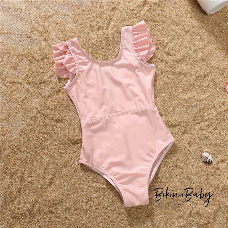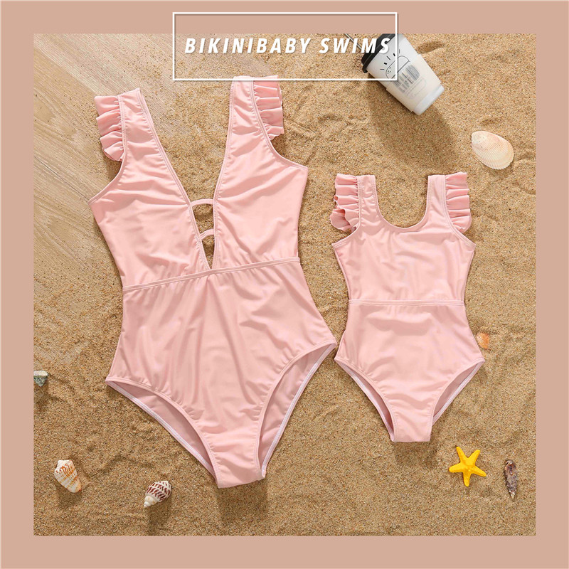 BKBY solid color ruffled one-piece swimsuit mother women beach hot spring parent-child swimsuit slim cute girl swimsuit