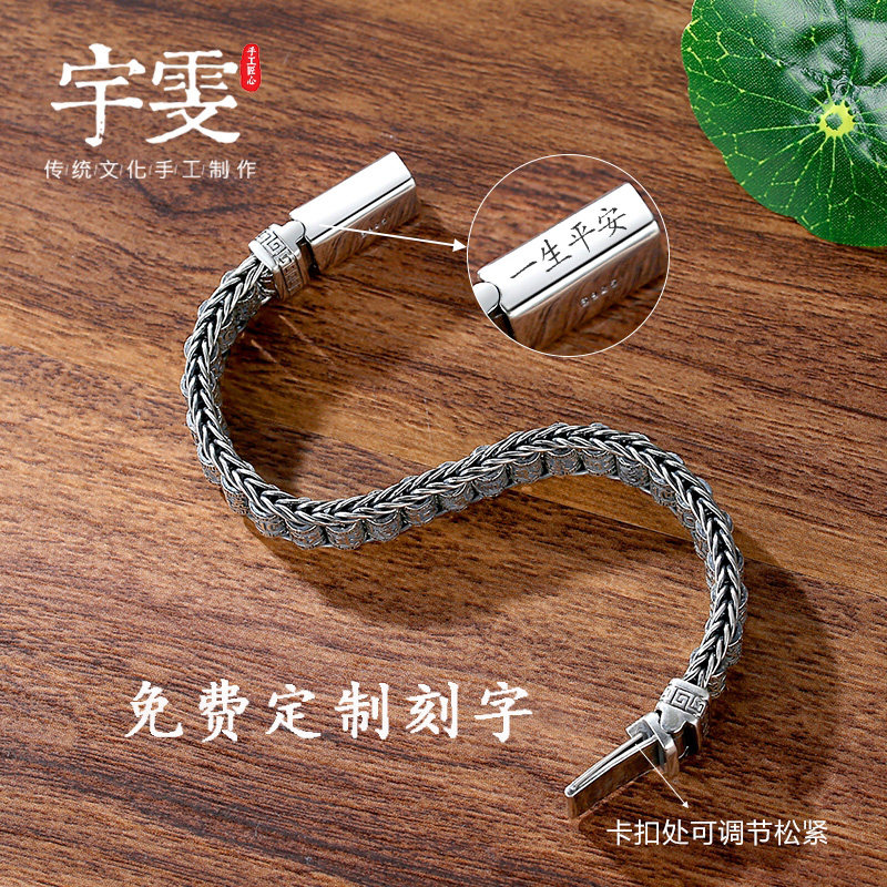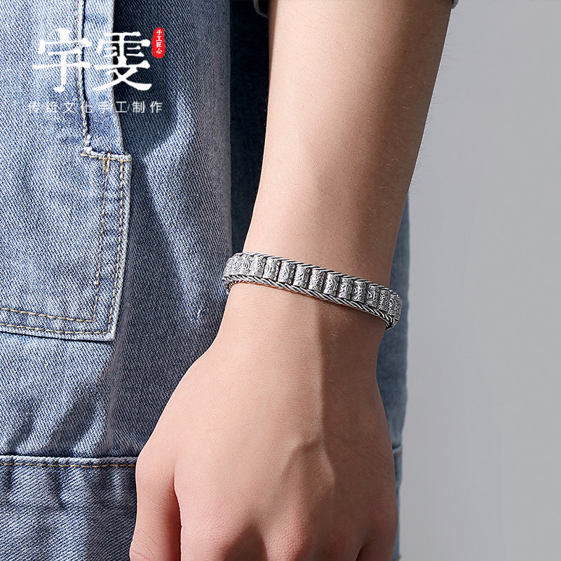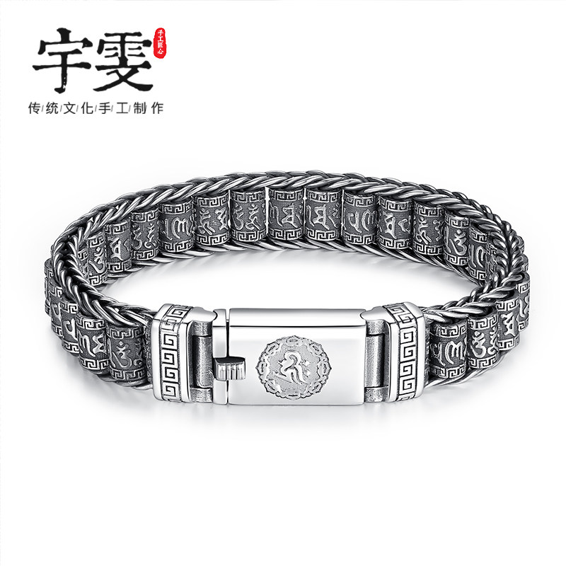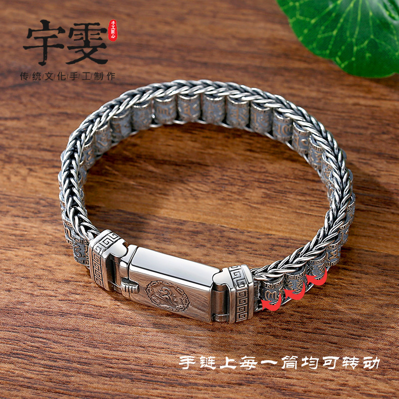 Yuwen bracelet men's S925 sterling silver hand-woven Buddhist six-character mantra prayer wheel silver chain hand ornament personality