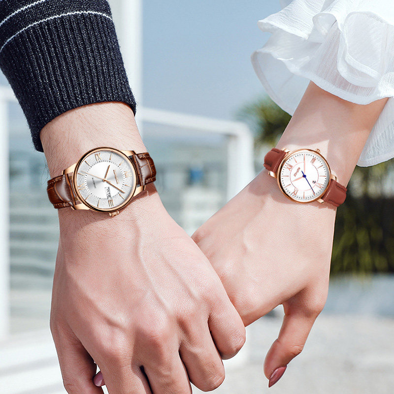 A pair of rose gold white and brown leather Rose blue and brown leather men's watch Rose white and brown leather women's watch Rose white men's watch Rose white and red leather women's watch Rose blue and brown leather men's watch Rose white and blue leather women's watch White, white and black men's watch Rose white and white