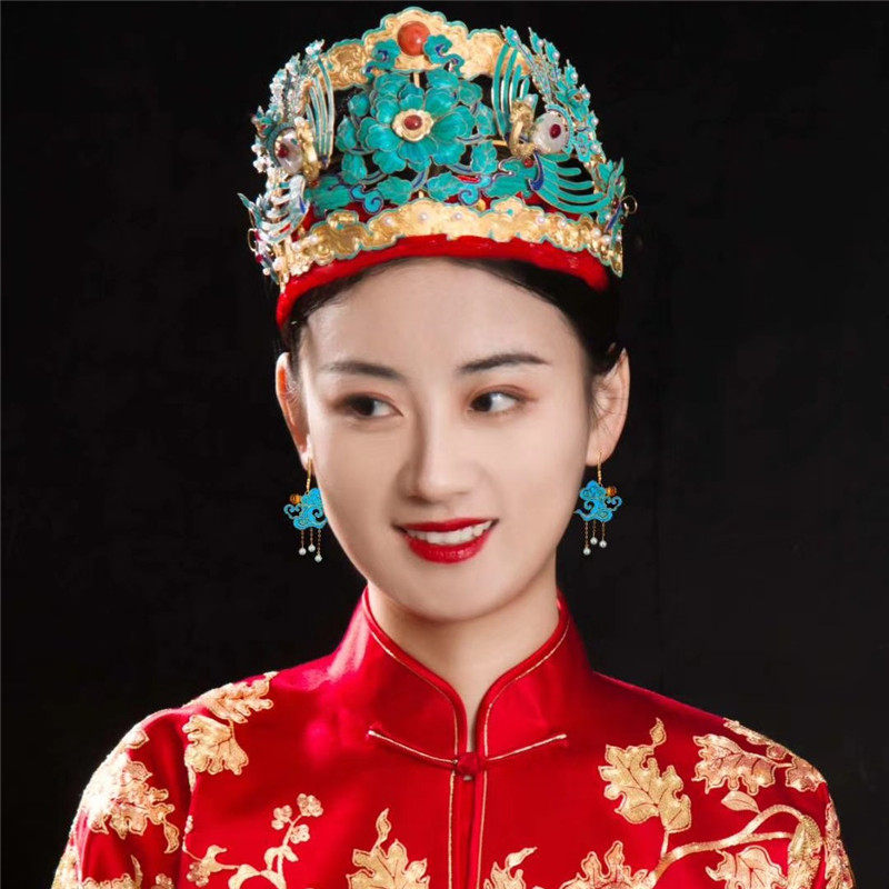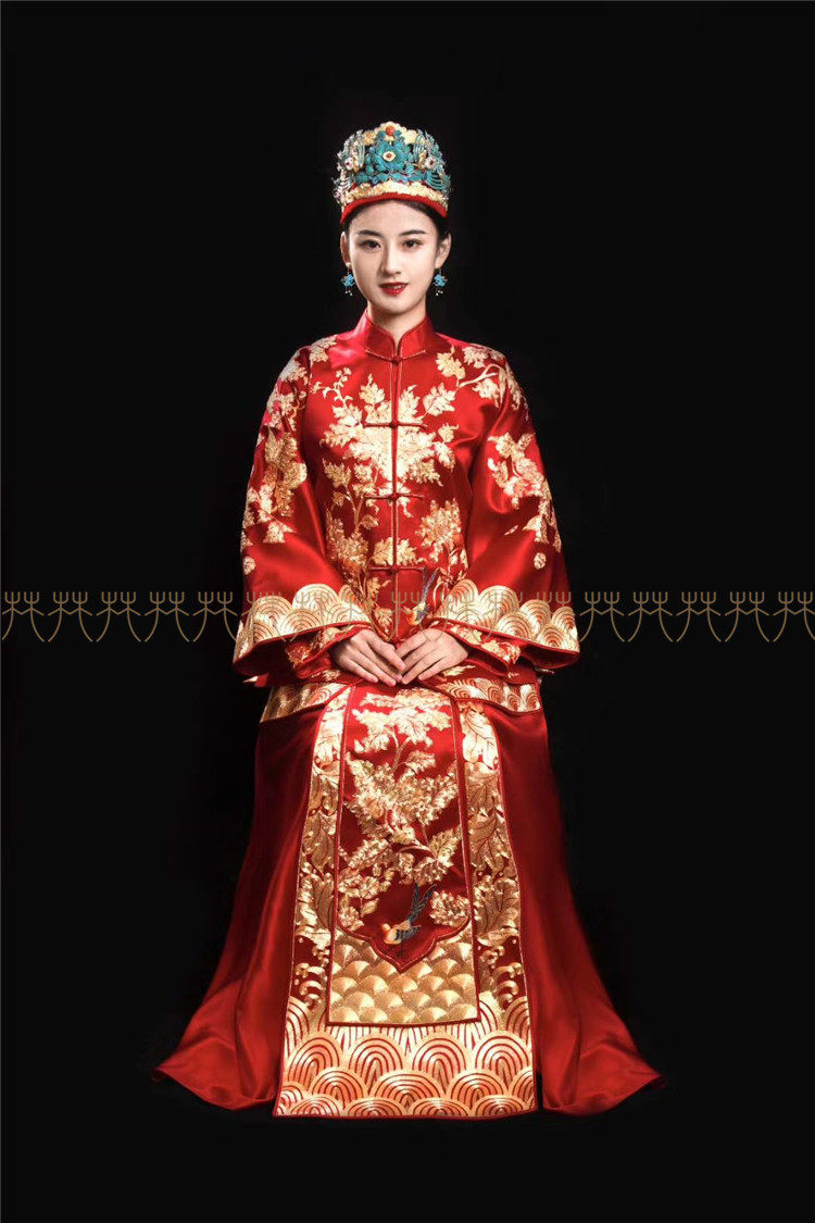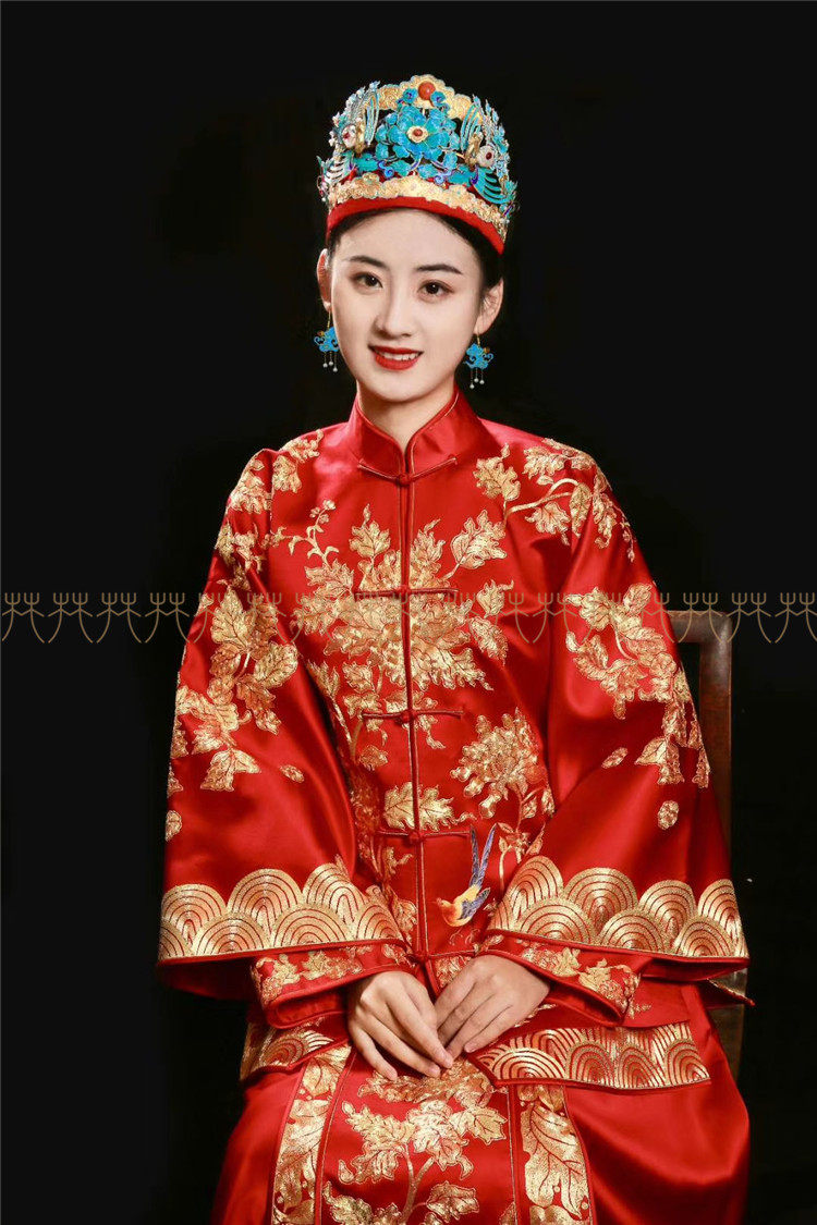 Huffin wedding dress with small bird peony handmade disc gold embroidery Su embroidery Show and Chinese style wedding dress front and back horse face dress