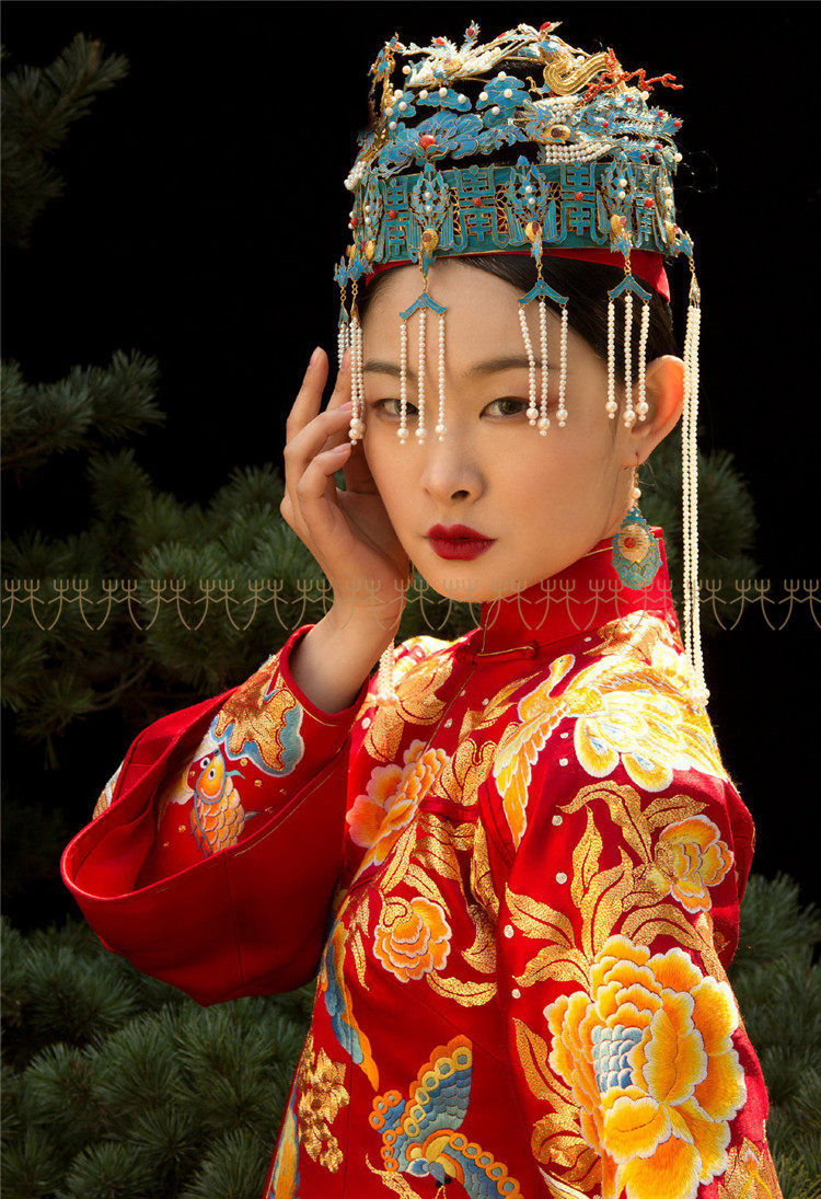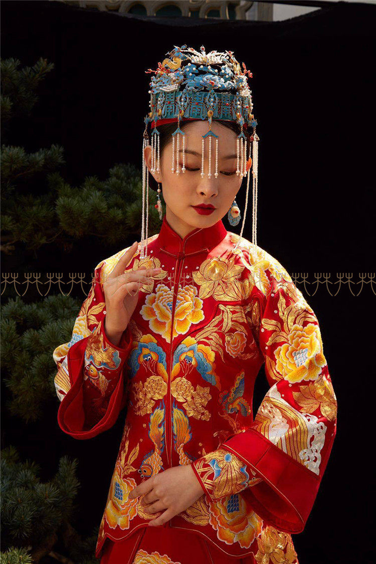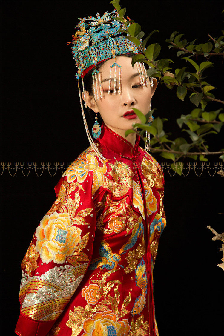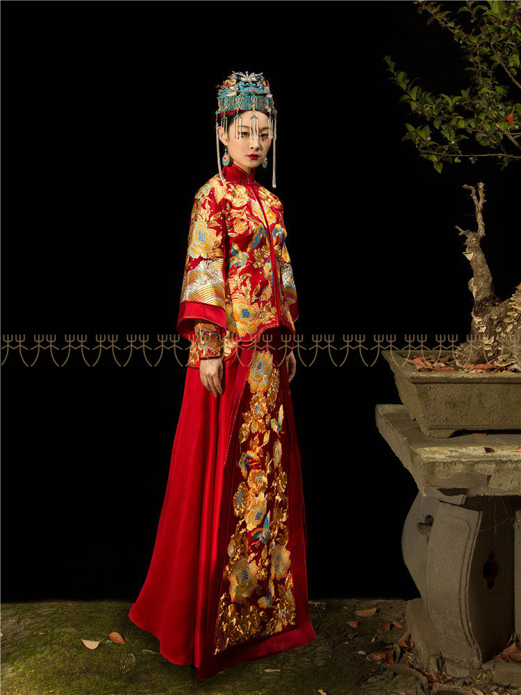 Huafen wedding dress Suzhou embroidery peony flower Xiuhe dress Small trailing Chinese dress Peacock plate gold Chinese wedding dress