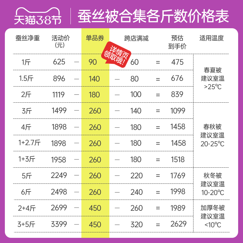 (Summer quilt) 100% mulberry filament net weight 1 kg (summer quilt) 100% mulberry filament net weight 1.5 kg (air conditioning quilt) 100% mulberry filament net weight 2 kg (spring and autumn quilt) 100% mulberry filament net weight 3 kg (spring and autumn quilt) 100% mulberry filament net weight 4 kg (winter quilt) 100% mulberry filament net weight 5 kg (winter quilt) 100% mulberry filament net weight 6 kg (mother-to-child quilt) 100% mulberry filament net weight 1+3 kg (mother-to-child quilt) 100% mulberry filament net weight 2+4 kg (mother-son quilt) 100% Mulberry silkworm filament net weight 3+5 kg (live exclusive) 100% mulberry filament net weight 1+2 kg (mother-to-child quilt) 100% mulberry filament net weight 1+2.7 kg