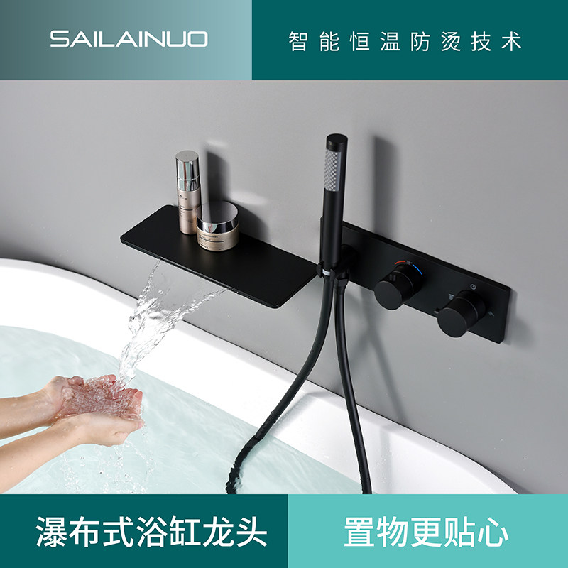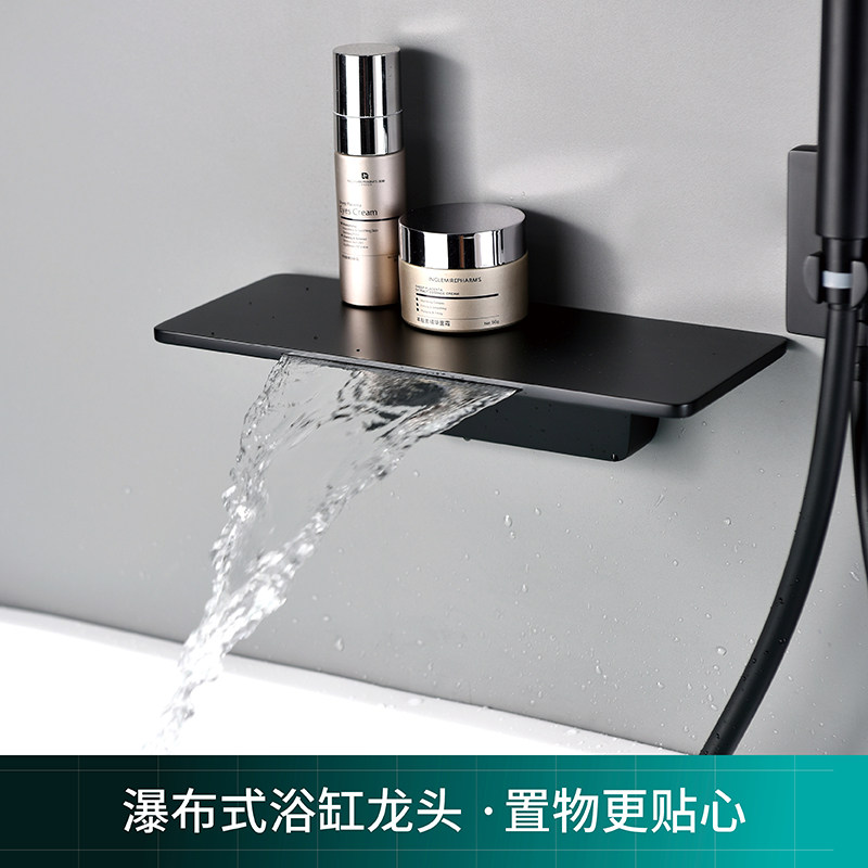 Smart thermostatic black bathtub concealed large waterfall tap with placement table embedded into the wall shower suit hotel