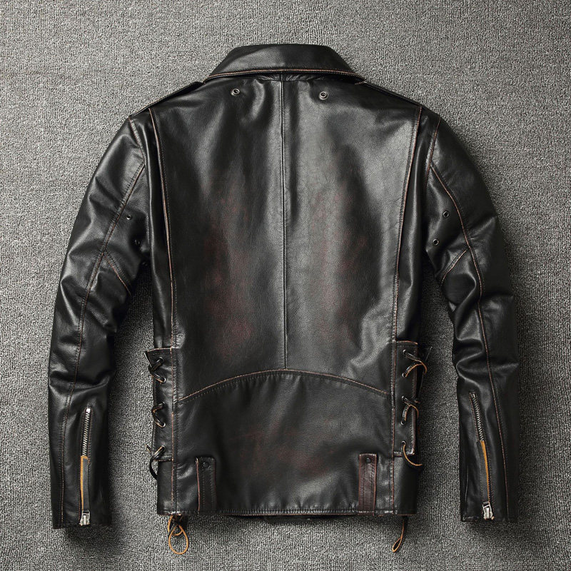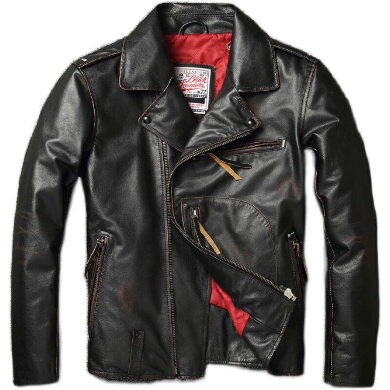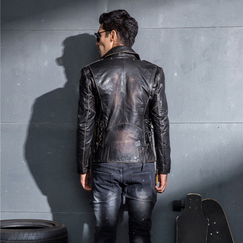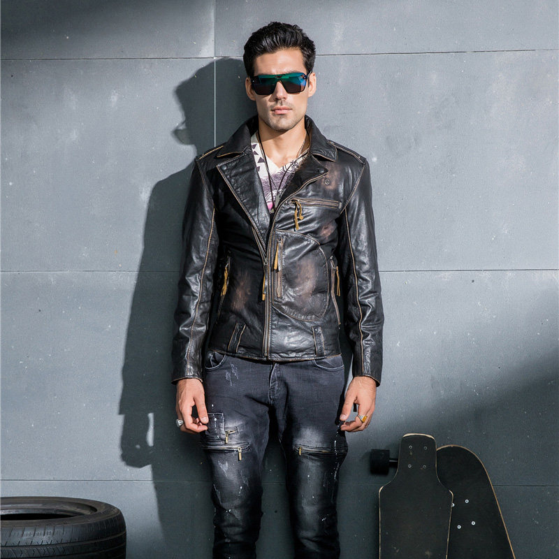 Genuine leather jacket men's lapel oblique zipper slim short pure cowhide riding motorcycle suit retro leather jacket jacket tide