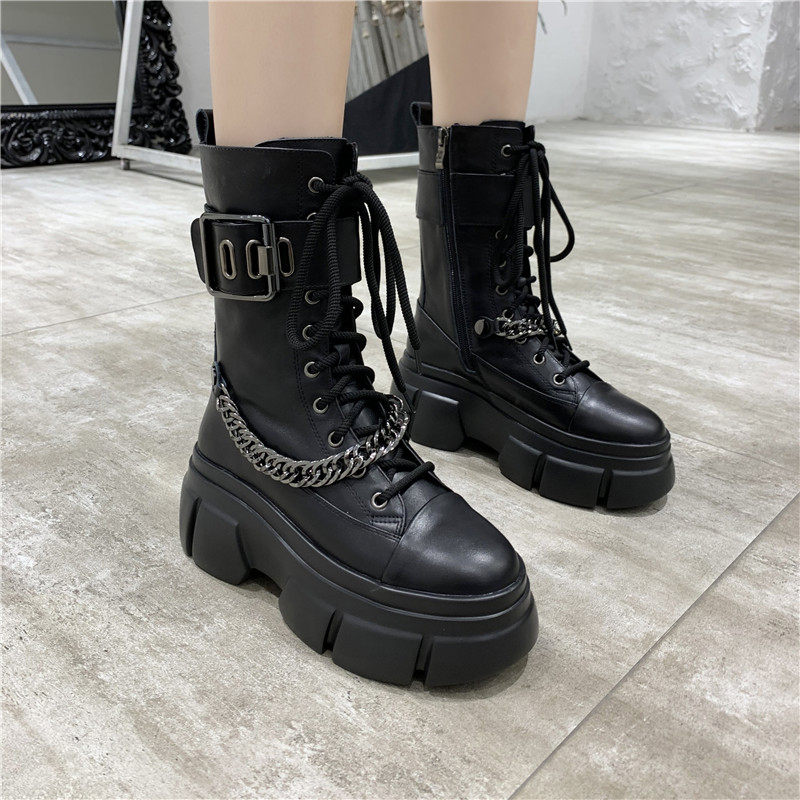 European station leather Martin boots women's 2022 new thick bottom muffin plus velvet belt buckle British style chain boots