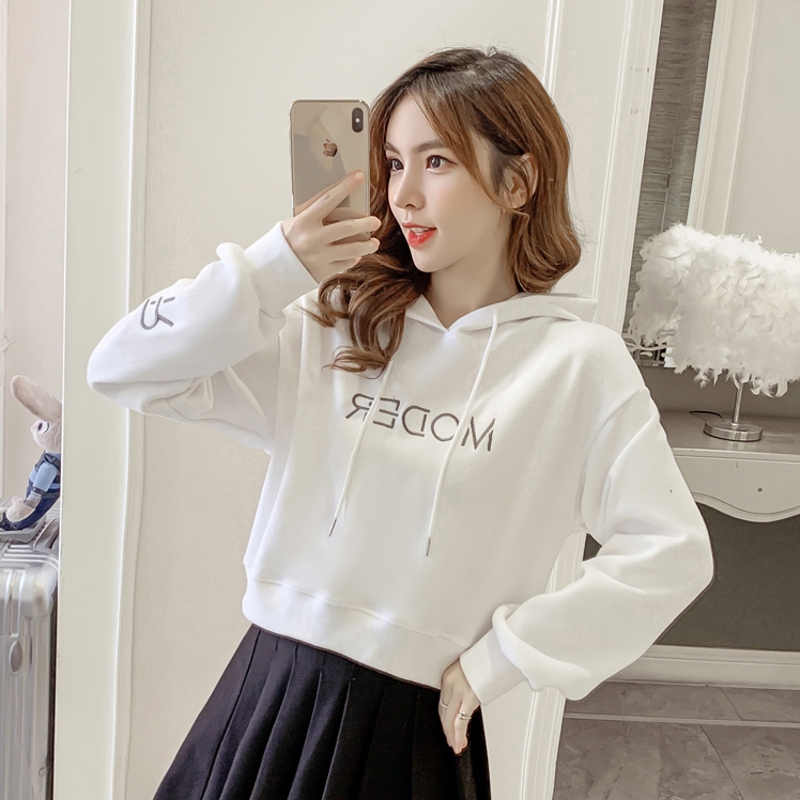 High-waisted short sweater women's fleece thickened long-sleeved autumn and winter new 2020 Korean version embroidered loose and lazy wind top