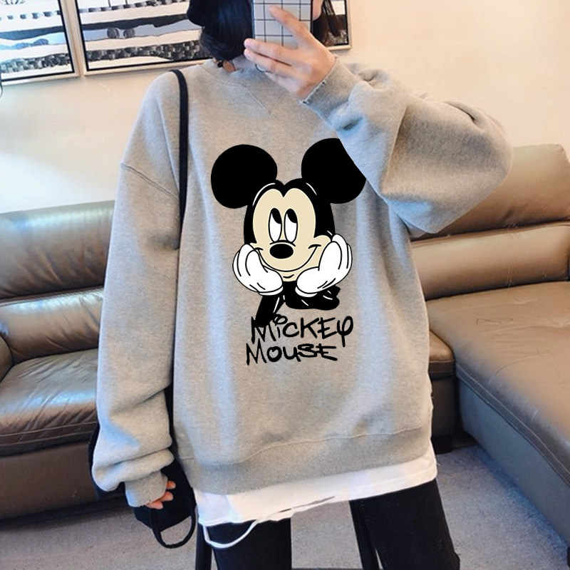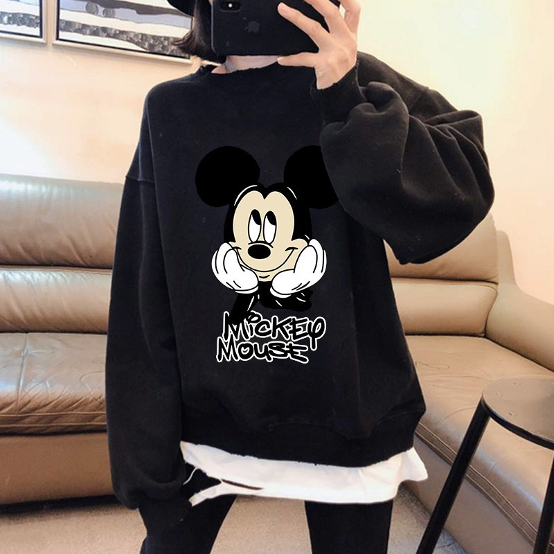 2020 autumn and winter New thick cotton T women plus velvet cartoon Mickey Korean loose version of the big version of the shirt fake Two ins tide