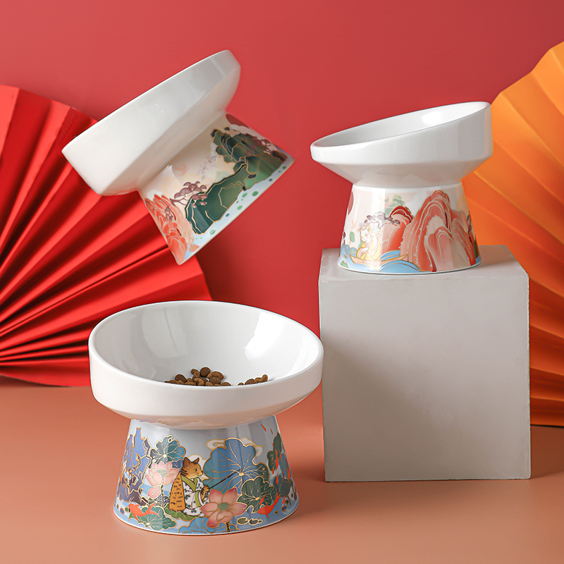 Cat Bowl Ceramic High Feet Feeding Protection Cervical Spine Cute Chinese Style Cat Bowl Water Bowl Pet Dog Bowl Cat Food Basin