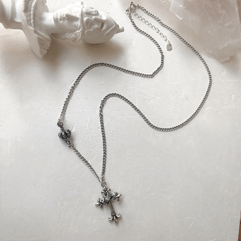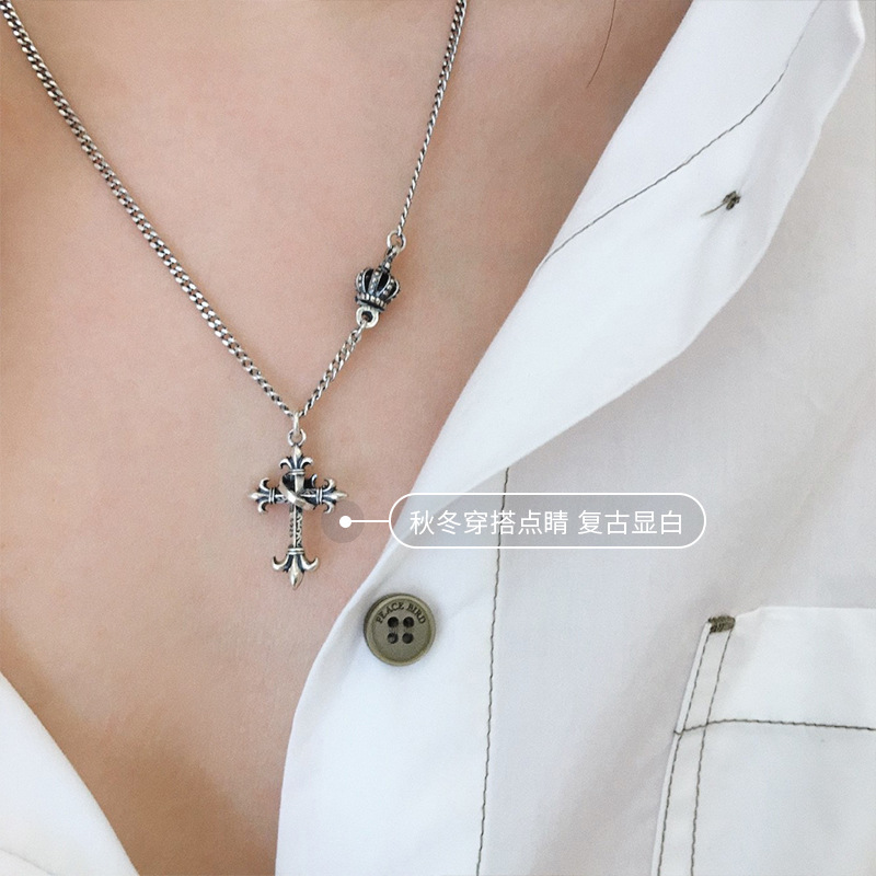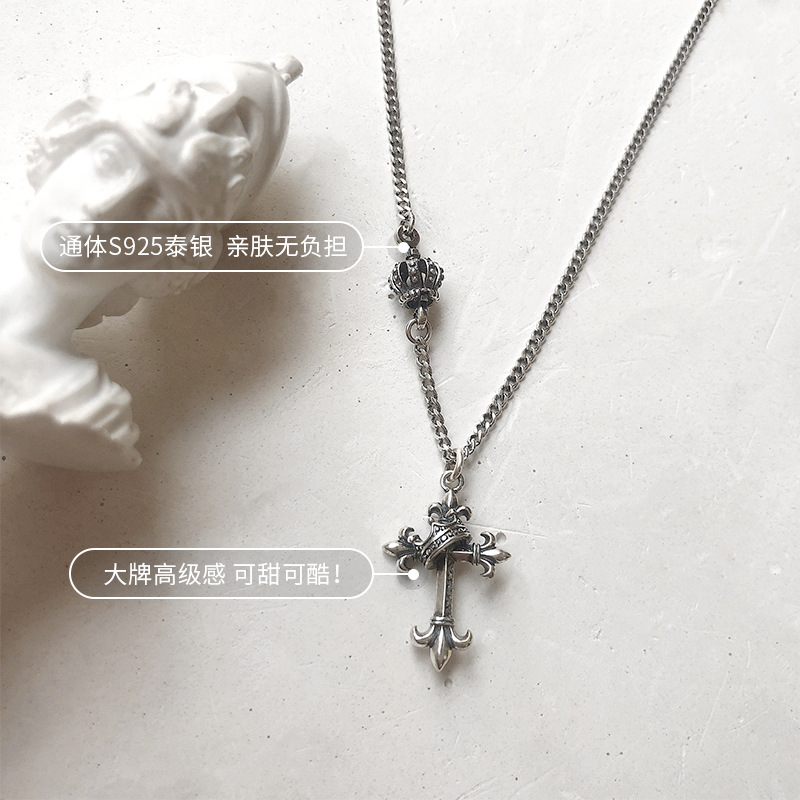 s925 silver custom cross necklace sweater chain female retro autumn and winter simple crown light luxury niche ins tide