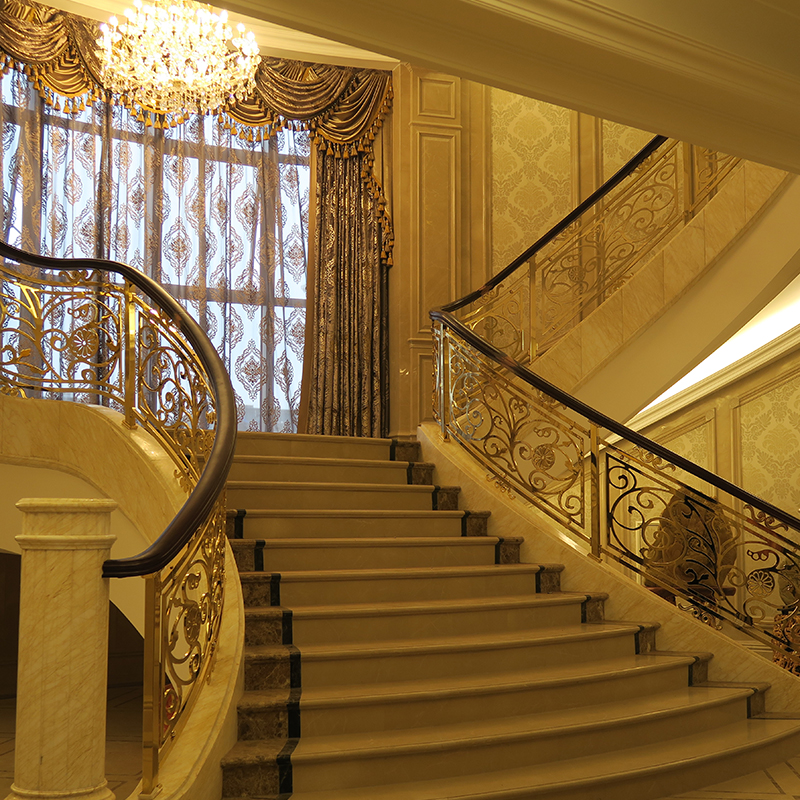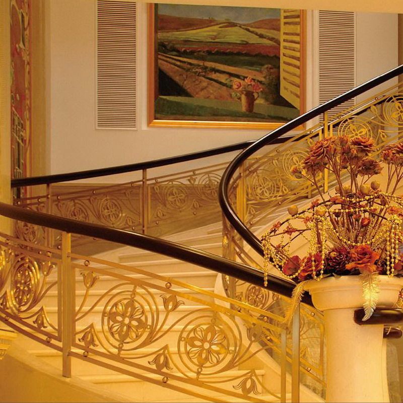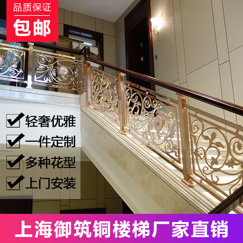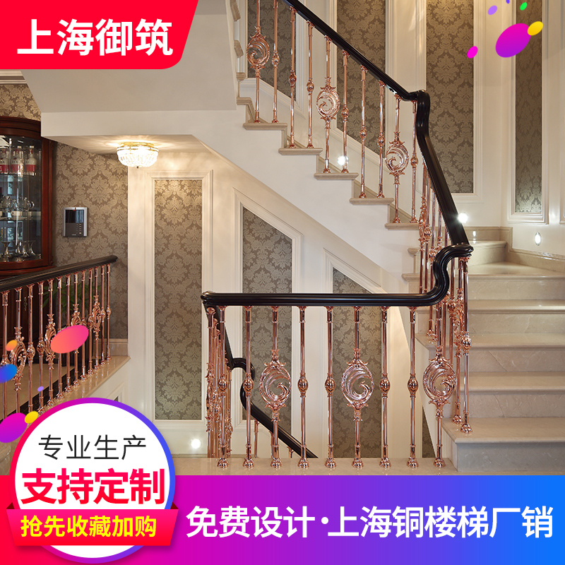 Villa indoor staircase copper handrail arc rotating guardrail copper art aluminum art decoration retro custom railing fence