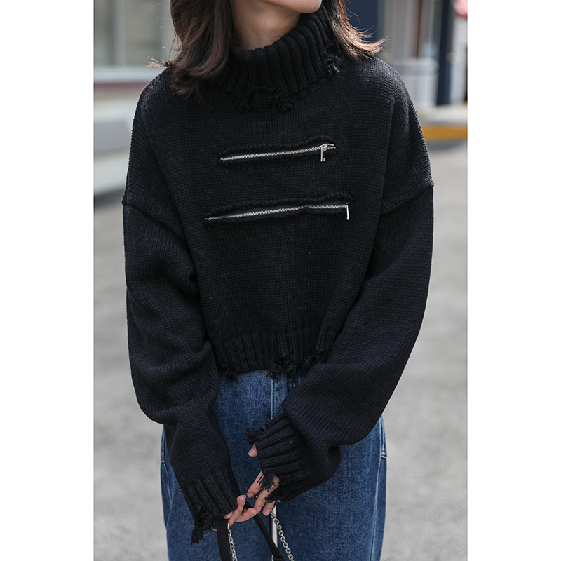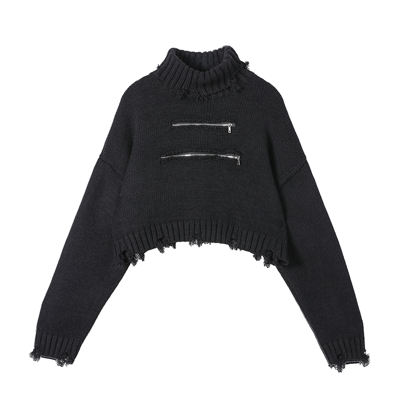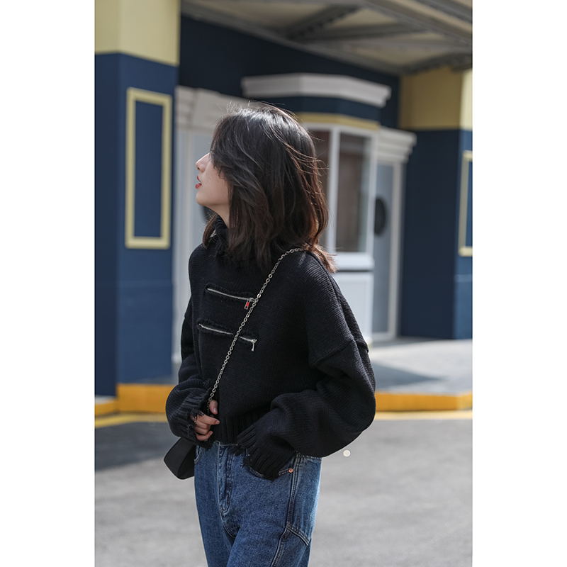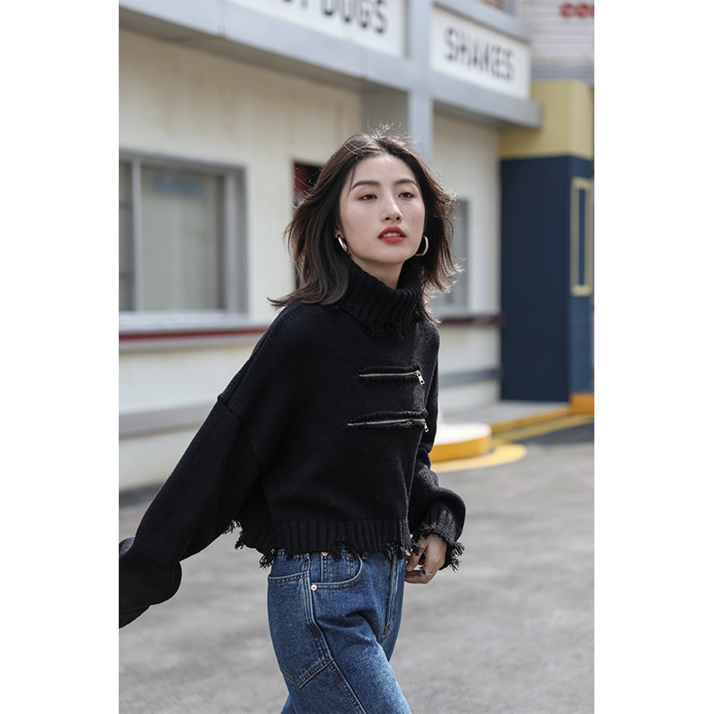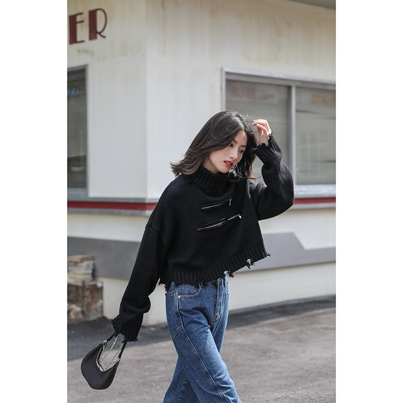 "You Lane" Black Turtleneck Sweater Women's Loose, Slim, Lazy, Tear-Edge Design, Small Mori Short Top