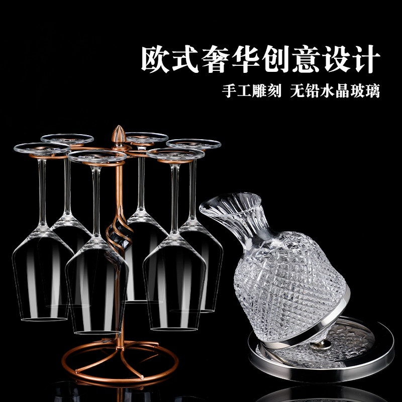 Carved base crystal rotating decanter + carved 270ML wine glasses 6pcs + bronze European cup holder - simple