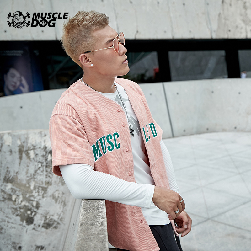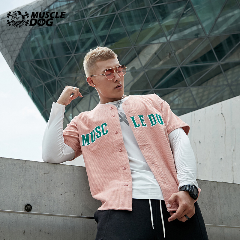 Muscle dog tide brand printed corduroy loose sports casual shirt Fitness clothes training clothes Short-sleeved T-shirt men