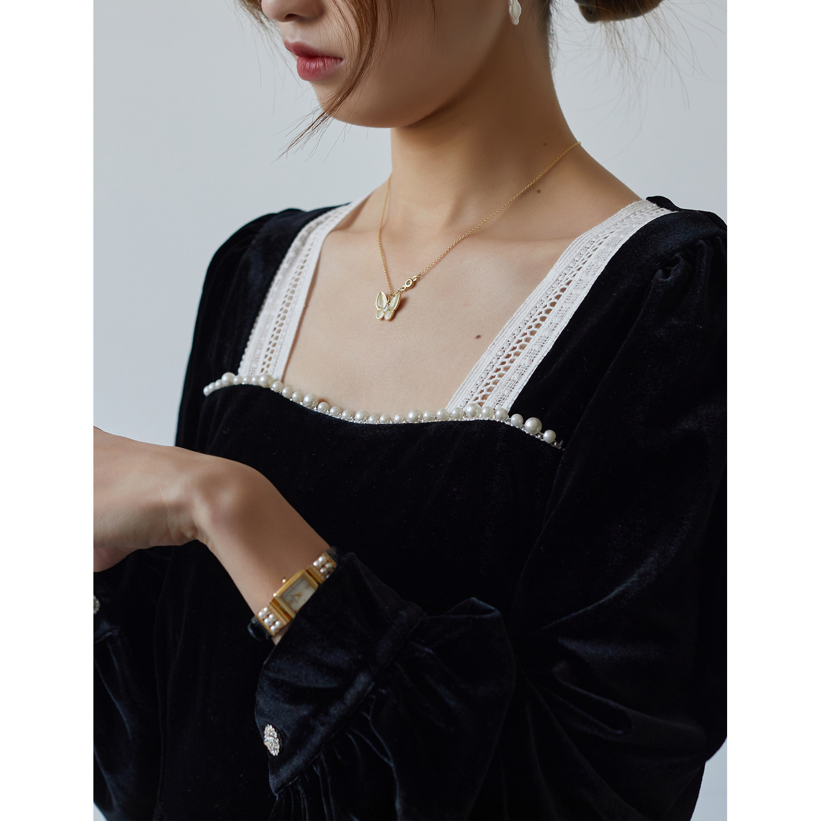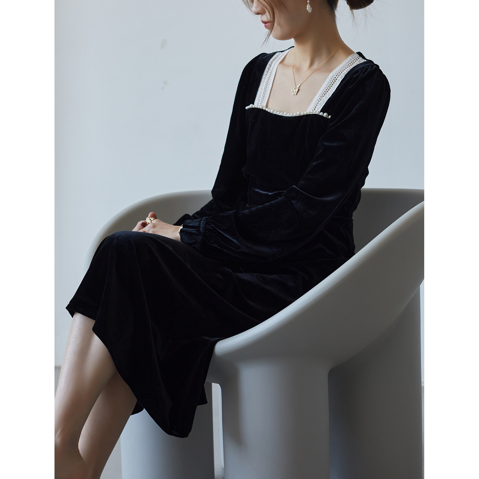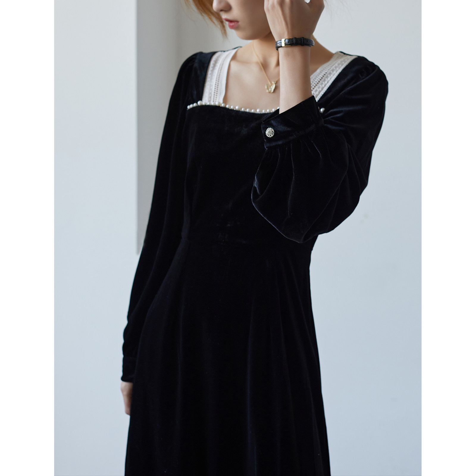 SEEK AUTUMN pearl black velvet French court style little black dress dress retro square collar waist long skirt
