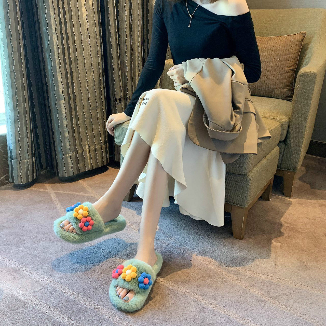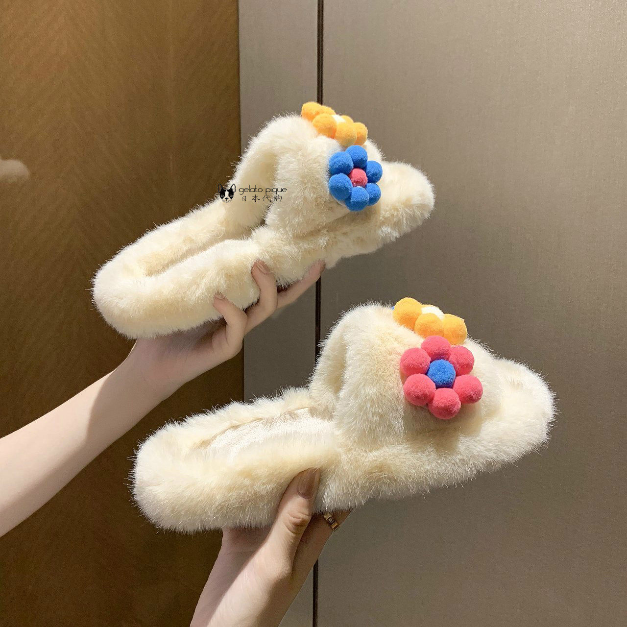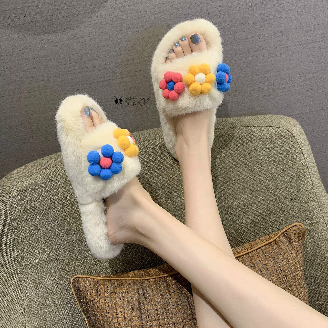 Japan 2020 autumn and winter new Hyunya wind warmth one-word flat bottom outside the home wearing rabbit wool slippers woman